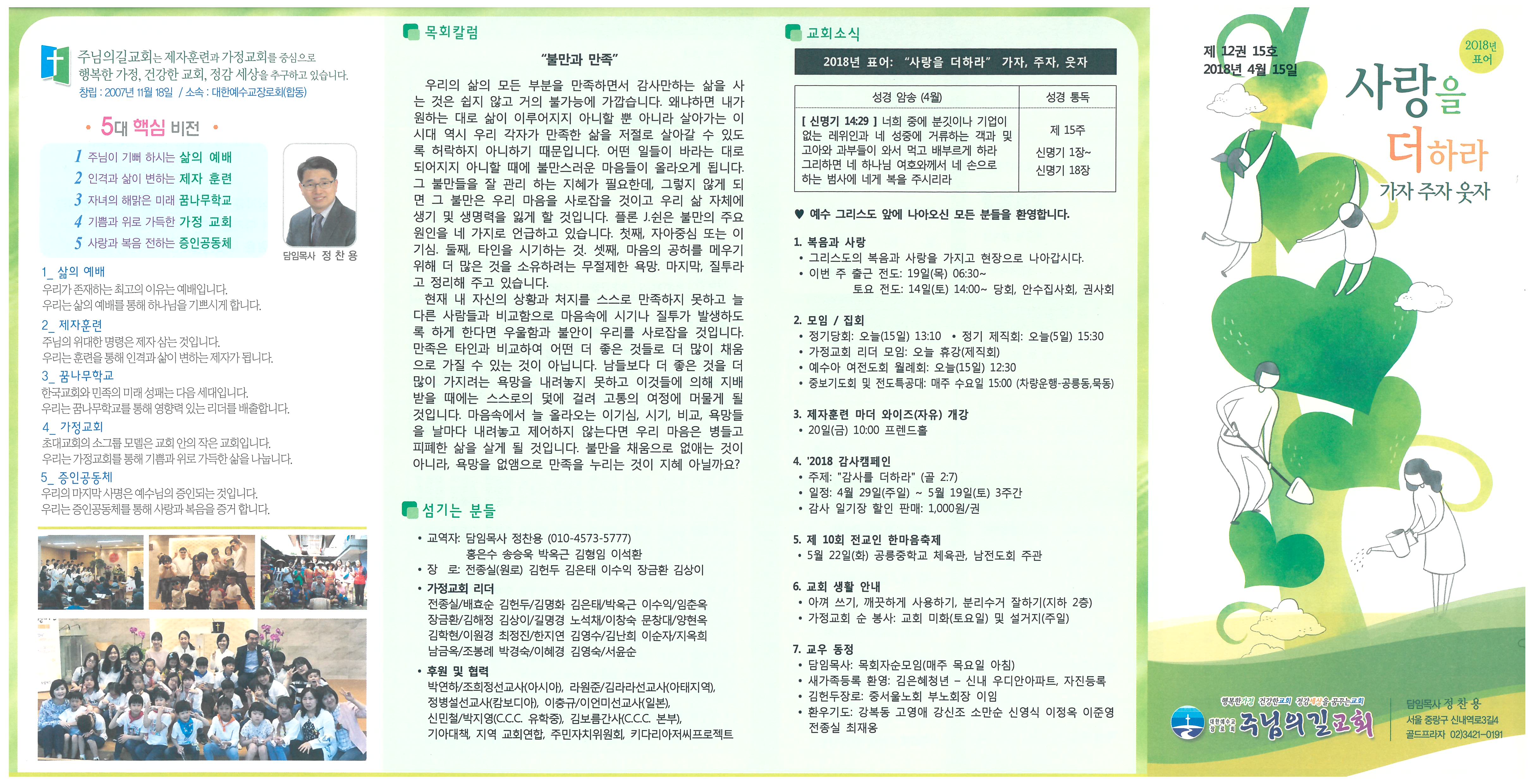 ♥ 예수 그리스도 앞에 나아오신 모든 분들을 환영합니다. 1. 복음과 사랑 • 그리스도의 복음과 사랑을 가지고 현장으로 나아갑시다. • 이번 주 출근 전도: 19일(목) 06:30~ 토요 전도: 14일(토) 14:00~ 당회, 안수집사회, 권사회 2. 모임 / 집회 • 정기당회: 오늘(15일) 13:10 • 정기 제직회: 오늘(5일) 15:30 • 가정교회 리더 모임: 오늘 휴강(제직회) • 예수아 여전도회 월례회: 오늘(15일) 12:30 • 중보기도회 및 전도특공대: 매주 수요일 15:00 (차량운행-공릉동,묵동) 3. 제자훈련 마더 와이즈(자유) 개강 • 20일(금) 10:00 프렌드홀 4. '2018 감사캠페인 • 주제: "감사를 더하라" (골 2:7) • 일정: 4월 29일(주일) ~ 5월 19일(토) 3주간 • 감사 일기장 할인 판매: 1,000원/권 5. 제 10회 전교인 한마음축제 • 5월 22일(화) 공릉중학교 체육관, 남전도회 주관 6. 교회 생활 안내 • 아껴 쓰기, 깨끗하게 사용하기, 분리수거 잘하기(지하 2층) • 가정교회 순 봉사: 교회 미화(토요일) 및 설거지(주일) 7. 교우 동정 • 담임목사: 목회자순모임(매주 목요일 아침) • 새가족등록 환영: 김은혜청년 – 신내 우디안아파트, 자진등록 • 김헌두장로: 중서울노회 부노회장 이임 • 환우기도: 강복동 고영애 강신조 소만순 신영식 이정옥 이준영 전종실 최재옹