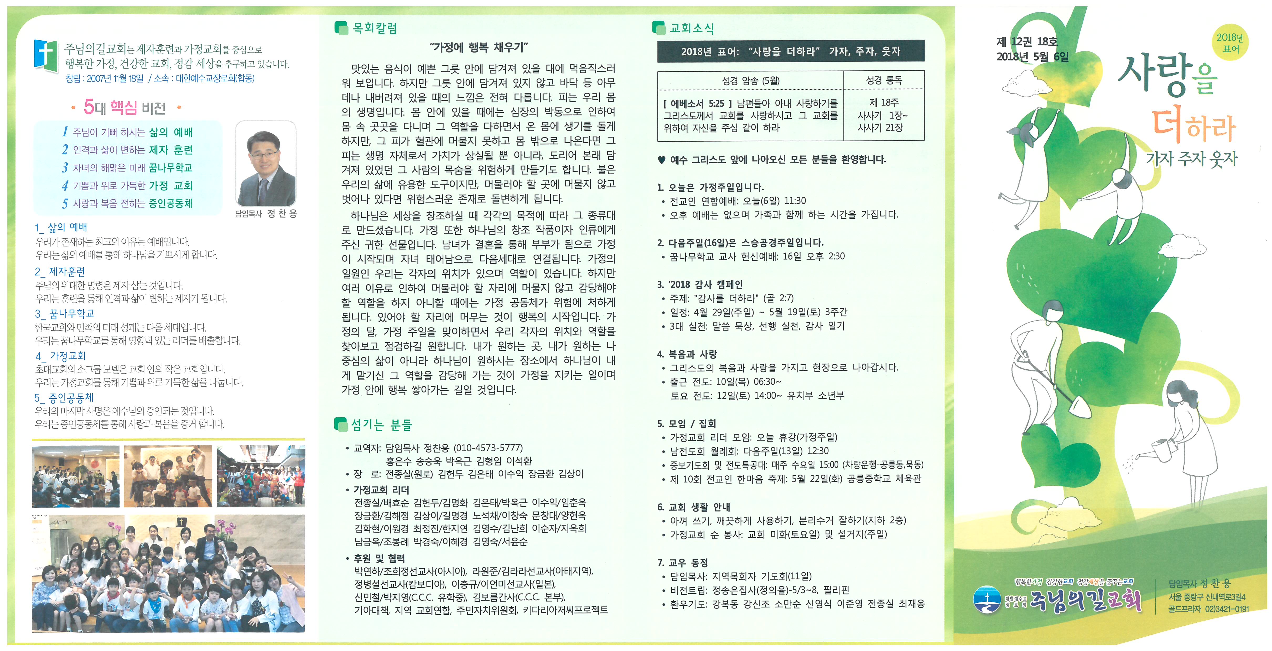♥ 예수 그리스도 앞에 나아오신 모든 분들을 환영합니다. 1. 오늘은 가정주일입니다. • 전교인 연합예배: 오늘(6일) 11:30 • 오후 예배는 없으며 가족과 함께 하는 시간을 가집니다. 2. 다음주일(16일)은 스승공경주일입니다. • 꿈나무학교 교사 헌신예배: 16일 오후 2:30 3. '2018 감사 캠페인 • 주제: "감사를 더하라" (골 2:7) • 일정: 4월 29일(주일) ~ 5월 19일(토) 3주간 • 3대 실천: 말씀 묵상, 선행 실천, 감사 일기