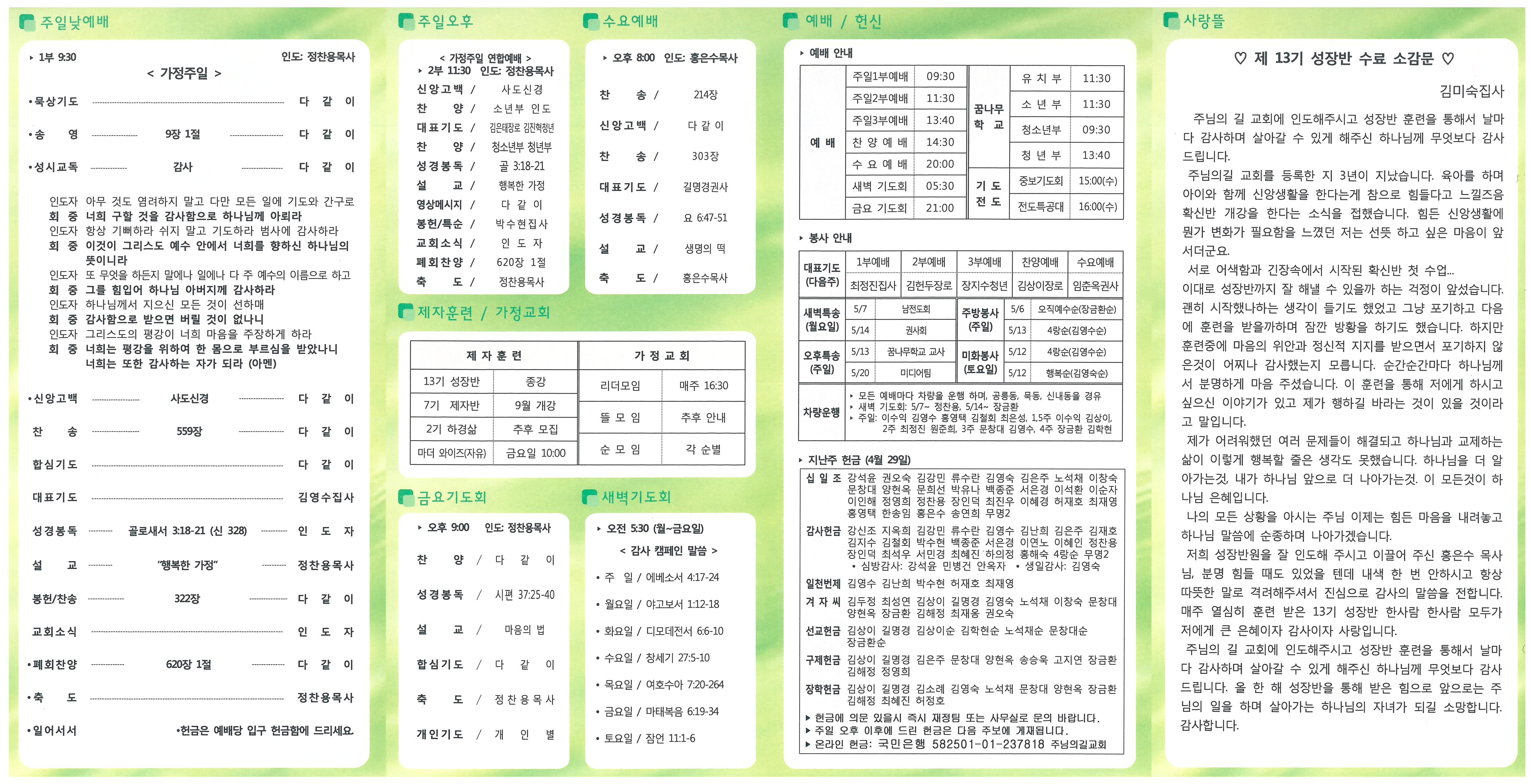 4. 복음과 사랑 • 그리스도의 복음과 사랑을 가지고 현장으로 나아갑시다. • 출근 전도: 10일(목) 06:30~ 토요 전도: 12일(토) 14:00~ 유치부 소년부 5. 모임 / 집회 • 가정교회 리더 모임: 오늘 휴강(가정주일) • 남전도회 월례회: 다음주일(13일) 12:30 • 중보기도회 및 전도특공대: 매주 수요일 15:00 (차량운행-공릉동,묵동) • 제 10회 전교인 한마음 축제: 5월 22일(화) 공릉중학교 체육관 6. 교회 생활 안내 • 아껴 쓰기, 깨끗하게 사용하기, 분리수거 잘하기(지하 2층) • 가정교회 순 봉사: 교회 미화(토요일) 및 설거지(주일) 7. 교우 동정 • 담임목사: 지역목회자 기도회(11일) • 비전트립: 정송은집사(정의율)-5/3~8, 필리핀 • 환우기도: 강복동 강신조 소만순 신영식 이준영 전종실 최재옹