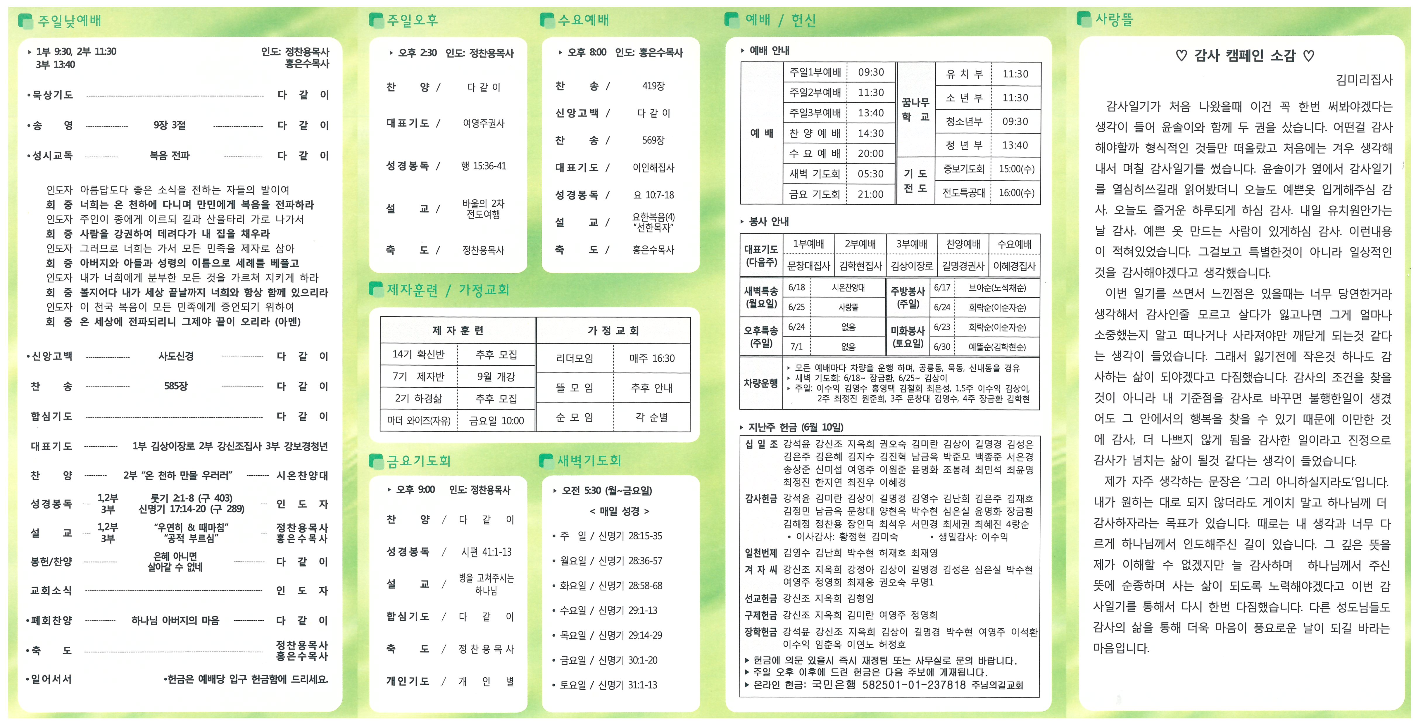 • "추수할 일꾼들을 보내 주소서" (눅 10:2) • 이번주: VIP 카톡 초청, VIP 짝꿍 만남, 순 금식기도 실시, 전단지 배부 • 다음주: VIP 순모임 초청, 선물 전달 2. 찬양 콘서트: 최인혁 찬양사역자, 7월 1일(주일) 오후 3시 • 초청 안내지를 VIP 대상자와 이웃에게 전달해 주세요. 3. 모임 / 집회 • 가정교회 리더 모임: 매주 오후 예배 후 • 예수아 여전도회 월례회: 오늘(17일) 12:30 • 중보기도회 및 전도특공대: 매주 수요일 15:00 (차량운행) • 권사회 월례회: 다음주일(24일) 4. 2/4분기 장학생 선발 및 장학금 수여 • 청년부: 김홍식 안세연 • 청소년부: 김하람 김재호 5. 성경 퀴즈대회: 7월15일(주일) 오후 2:30 • 범위: 잠언 11장-20장 • 방식: 개인 대항 및 가정교회 짝궁 순 대항(짝궁 순 각 4명) 6. 복음과 사랑 • 그리스도의 복음과 사랑을 가지고 현장으로 나아갑시다. • 아침 전도: 21일(목), 29일(목) 06:30 • 토요 전도: 6월 23일(토) 14:00 소년부 청년부 30일(토) 14:00 제직 • 주일 전도: 24일(다음주) 13:20 7. 교회 생활 안내 • 아껴 쓰기, 깨끗하게 사용하기, 분리배출 잘하기(교회 배란다) • 가정교회 순 봉사: 교회 미화(토요일) 및 설거지(주일) 8. 교우 동정 • 담임목사: 목회 아카데미(18일) • 선교사입국: 박연하/조희정선교사(중앙아시아) • 이사: 강복동집사, 고영애권사 - 양평 용문역 인근 • 출산: 남화옥집사 득손자 • 환우기도: 강복동 강신조 고영애 소만순 신영식 이준영 전종실 최재옹 최세권(퇴원)