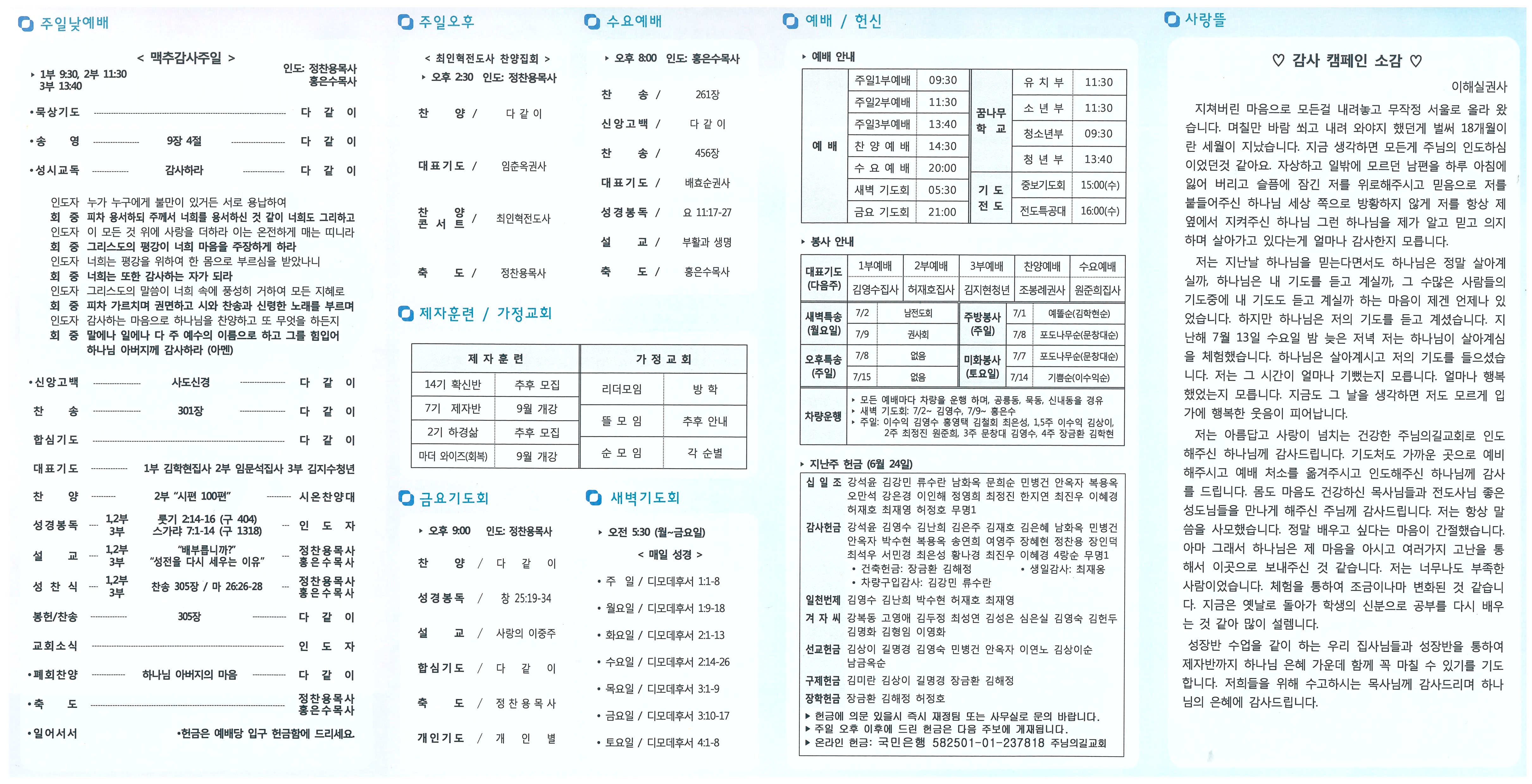 ♥ 예수 그리스도 앞에 나아오신 모든 분들을 환영합니다. 1. 맥추감사주일 및 성찬식: 다음주일(1일) 1,2,3부 예배시 • 전반기에 베푸신 은혜를 감사하고, 후반기를 감사로 시작합시다. 2. VIP 초청 • 오늘 주님의길교회 예배에 참석하신 분들을 환영하며 축복합니다. 3. 찬양집회: 오늘(1일) 오후 3:00, 최인혁전도사 초청 4. 모임 / 집회 • 가정교회 순모임 방학: 이번 주간에 방학 모임 • 중보기도회: 4일(수) 16:00, 기도 및 식사 (차량운행) • 정기 제직회: 7월 8일(주일) 오후 3:30 • 남전도회 월례회: 다음주일(8일) 12:30 • 예수아여전도회 세미나: “머리가 살아야 내가 산다” 두피전문 관리센터(정송은집사) 7/7일(토) 11시, 대상-예수아여전도회 회원 5. 제자훈련 수료 • 마더와이즈(자유): 강은경 김난희 문희순 서민경 서은경 이원경 정송은 6. 전반기 재정 감사: 다음주일(8일) • 대상: 재정을 수납하는 모든 기관 • 준비: 재정 장부 원본, 통장 사본, 영수증철, 증빙서류 • 감사: 김상이장로, 최정진집사 7. 성경 퀴즈대회: 7월15일(주일) 오후 2:30 • 범위: 잠언 11장-20장 • 방식: 개인 대항 및 가정교회 짝궁 순 대항(짝궁 순 각 4명) 8. 좋은 이웃 프로젝트 • 어르신 삼계탕 대접 - 초복(17일, 화요일) 12:00 o 대상: 65세 이상 교회 어르신 및 지역 어르신 초대 o 봉사: 권사회, 예수아 여전도회 7. 교회 생활 안내 • 아껴 쓰기, 깨끗하게 사용하기, 분리배출 협조 • 가정교회 순 봉사: 교회 미화(토요일) 및 설거지(주일) 8. 교우 동정 • 교역자 세미나: 2일(월)~3일(화) 1박 2일, 한화리조트 • 선교사 입국: 이충규, 이언미선교사(일본) • 성지탐방: 김은태장로, 박옥근권사(6/26~) • 환우기도: 강복동 강신조 고영애 박경숙(태능마이크로병원) 소만순 신영식 이동건(퇴원) 이준영 전종실 최재옹 최세권