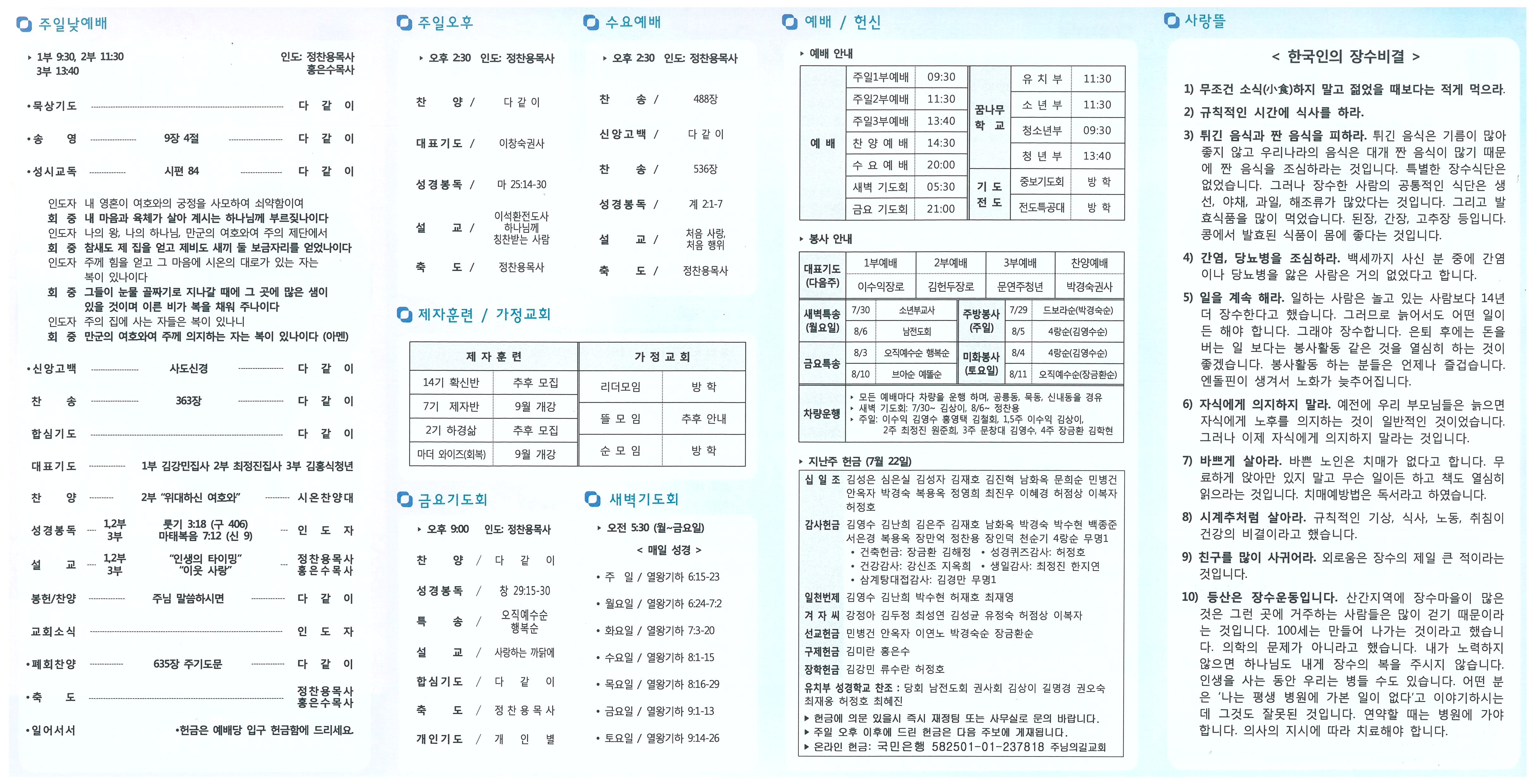 1. 꿈나무학교 여름 캠프 • 유치부: 은혜 중에 마쳤으며, 협력해 주심에 감사드립니다. • 소년부: 8/1-3, 도고켄싱턴리조트, "예수님, 사랑해요!" • 청소년부: 8/9-11, 맑은한강펜션, "빛의 자녀들" • 청년부: 8/16-18, 하늘빛쉼터, “니고데모의 안경” 2. 모임 / 집회 • 금요 심야 기도회에 적극 초대합니다. 특송: 8/3 오직예수순 행복순, 8/10 브아순 예똘순 • 권사회 월례회: 오늘(29일) 12:30 3. 제자훈련 • 새가족반 수료: 이슬기 4. 농어촌교회 선교 협력 • 매실 액기스 판매(전남 고흥군 거금도 월포교회 강태봉목사 시무) 5. 교회 생활 안내 • 아껴 쓰기, 깨끗하게 사용하기, 분리배출 협조 • 냉방: 여름철 적정온도 26도를 기준으로 가동합니다. • 가정교회 순 봉사: 교회 미화(토요일) 및 설거지(주일) 6. 교우 동정 • 교역자 휴양: 홍은수목사(7월 30일 주간) • 중식 떡 제공: 김명화권사(퇴원) • 연주회 출국: 허재호집사(8/4~) • 수능 대상자: 김희은 박유나 이지우 • 환우기도: 강복동 강정아 김명화 박일우(서울의료원) 소만순 신영식 이준영 전종실