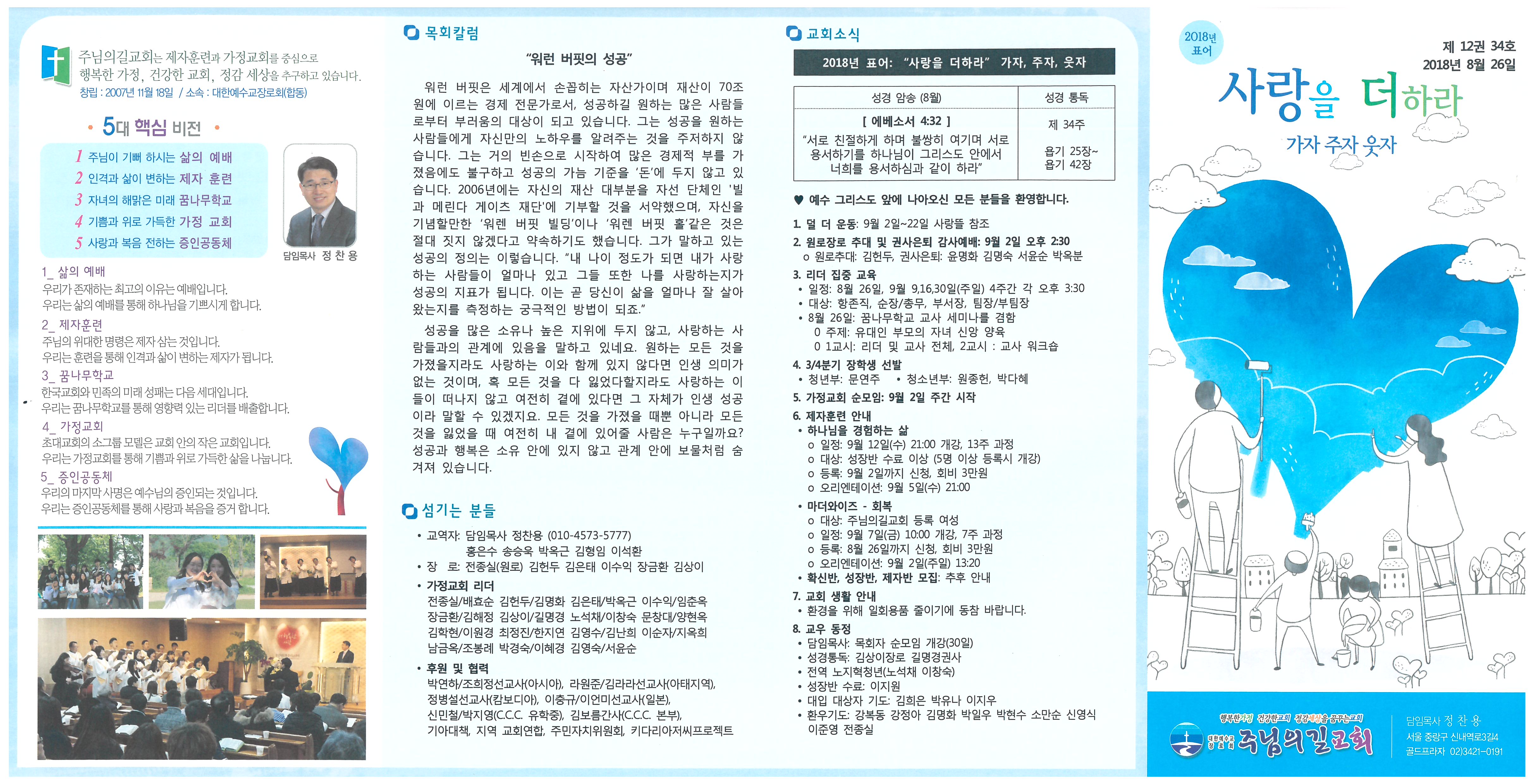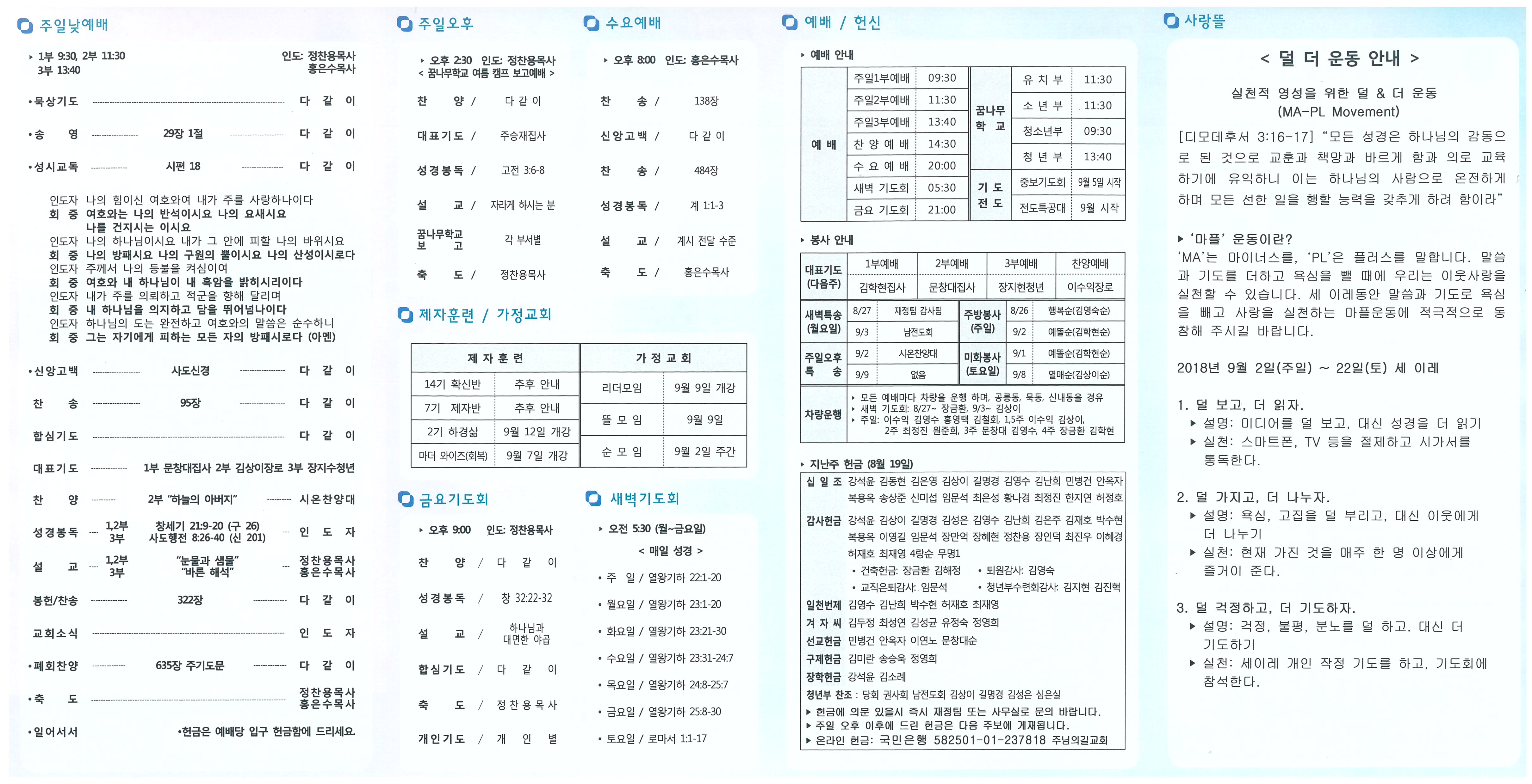 ♥ 예수 그리스도 앞에 나아오신 모든 분들을 환영합니다. 1. 덜 더 운동: 9월 2일~22일 사랑뜰 참조 2. 원로장로 추대 및 권사은퇴 감사예배: 9월 2일 오후 2:30 o 원로추대: 김헌두, 권사은퇴: 윤명화 김명숙 서윤순 박옥분 3. 리더 집중 교육 • 일정: 8월 26일, 9월 9,16,30일(주일) 4주간 각 오후 3:30 • 대상: 항존직, 순장/총무, 부서장, 팀장/부팀장 • 8월 26일: 꿈나무학교 교사 세미나를 겸함 0 주제: 유대인 부모의 자녀 신앙 양육 0 1교시: 리더 및 교사 전체, 2교시 : 교사 워크숍 4. 3/4분기 장학생 선발 • 청년부: 문연주 • 청소년부: 원종헌, 박다혜 5. 가정교회 순모임: 9월 2일 주간 시작 6. 제자훈련 안내 • 하나님을 경험하는 삶 o 일정: 9월 12일(수) 21:00 개강, 13주 과정 o 대상: 성장반 수료 이상 (5명 이상 등록시 개강) o 등록: 9월 2일까지 신청, 회비 3만원 o 오리엔테이션: 9월 5일(수) 21:00 • 마더와이즈 - 회복 o 대상: 주님의길교회 등록 여성 o 일정: 9월 7일(금) 10:00 개강, 7주 과정 o 등록: 8월 26일까지 신청, 회비 3만원 o 오리엔테이션: 9월 2일(주일) 13:20 • 확신반, 성장반, 제자반 모집: 추후 안내 7. 교회 생활 안내 • 환경을 위해 일회용품 줄이기에 동참 바랍니다. 8. 교우 동정 • 담임목사: 목회자 순모임 개강(30일) • 성경통독: 김상이장로 길명경권사 • 전역 노지혁청년(노석채 이창숙) • 성장반 수료: 이지원 • 대입 대상자 기도: 김희은 박유나 이지우 • 환우기도: 강복동 강정아 김명화 박일우 박현수 소만순 신영식 이준영 전종실