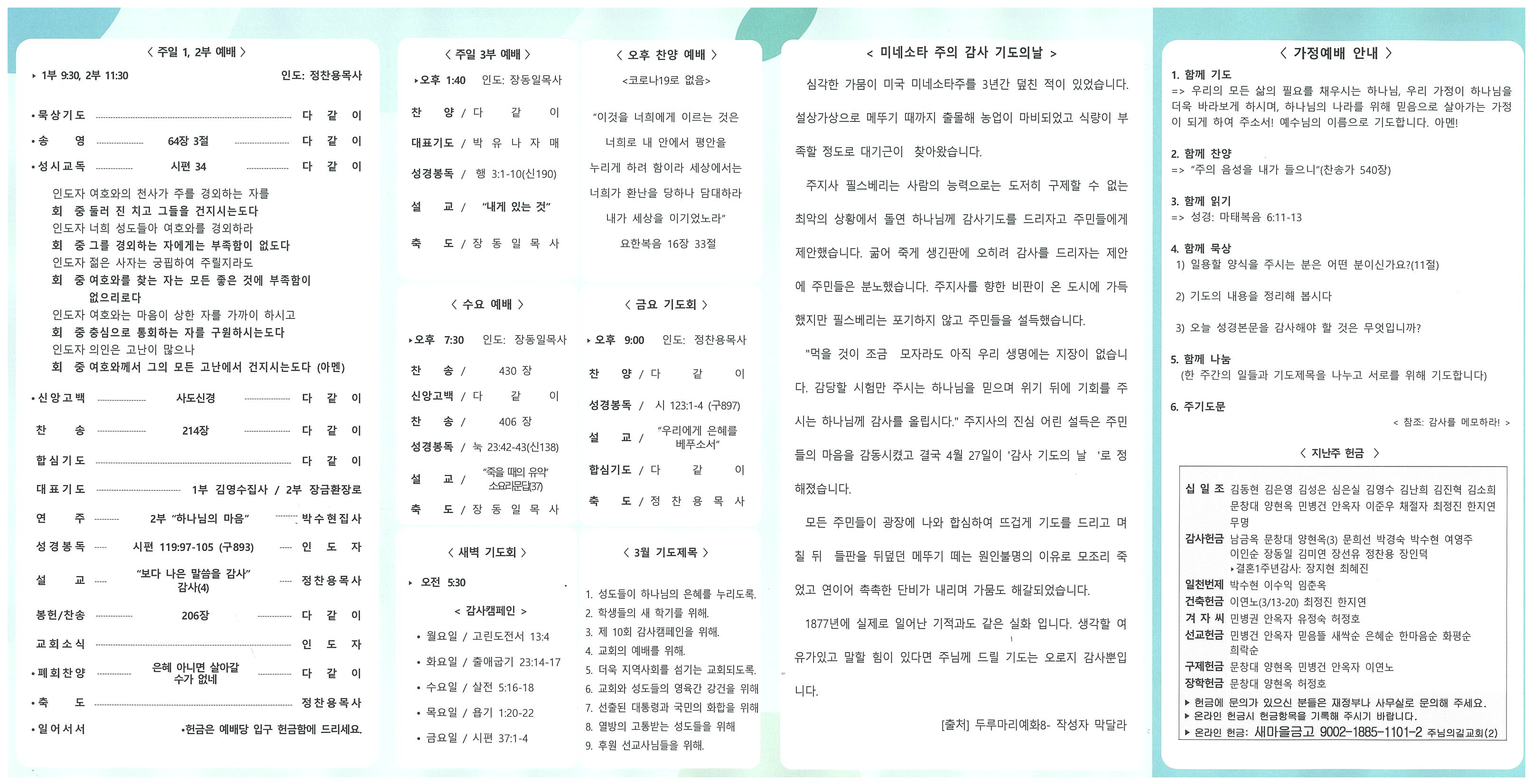 ♥ 예수 그리스도 앞에 나아오신 모든 분들을 환영합니다. ▶ 3월 성경암송 시편 73:28 “하나님께 가까이 함이 내게 복이라 내가 주 여호와를 나의 피난처로 삼아 주의 모든 행적을 전파하리이다” 1. 주님의길교회 핵심 비전 (1) "삶의 예배" 우리가 존재하는 최고의 이유는 예배입니다. 우리는 삶의 예배를 통해 하나님을 기쁘시게 합니다. 2. 제10회 감사캠페인: 2월 28일-4월 8일(40일간) • 주제: 감사를 메모하라! • 적용: 묵상하기, 기록하기, 실천하기 3. 유년부/소년부 성경학교 • 3월 6일(주), 13일(주), 20일(주), 27일(주) “왕의 자녀” 4. 집회/모임 • 가정교회 리더 교육: 매주 수요일 20:50, 온라인(줌) 5. 성경찬송책 표지갈이(리폼): 사무실에 신청바랍니다. • 금액: 레자: 15,000원(권당) • 3월 27일(오늘)까지 신청받습니다. (기간 1달소요) 6. 교우동정 • 개업: 장금환장로, 김해정권사- 여주 빵명장 (주소: 경기도 여주시 천송동 574, 전화: 010-5412-7004) |