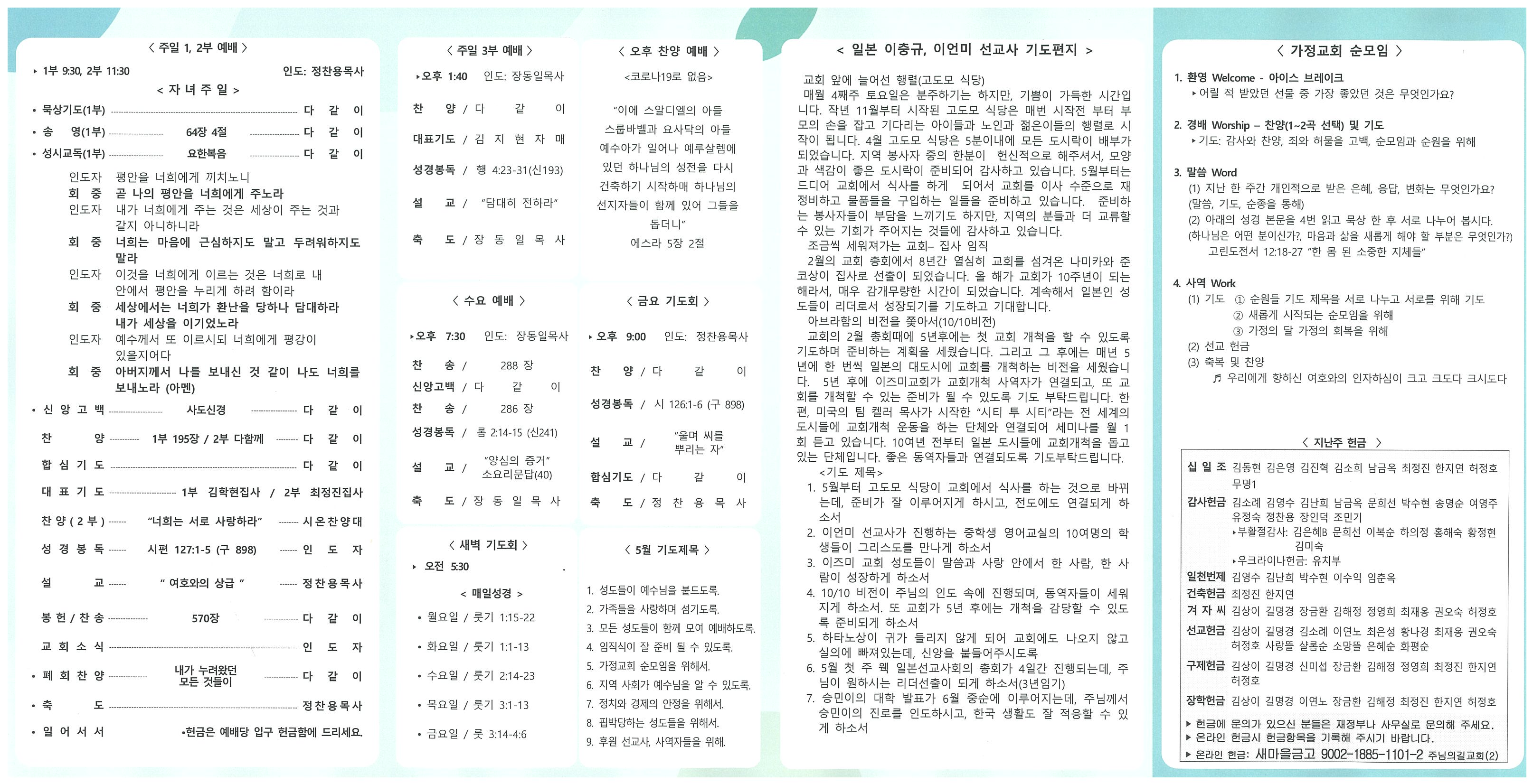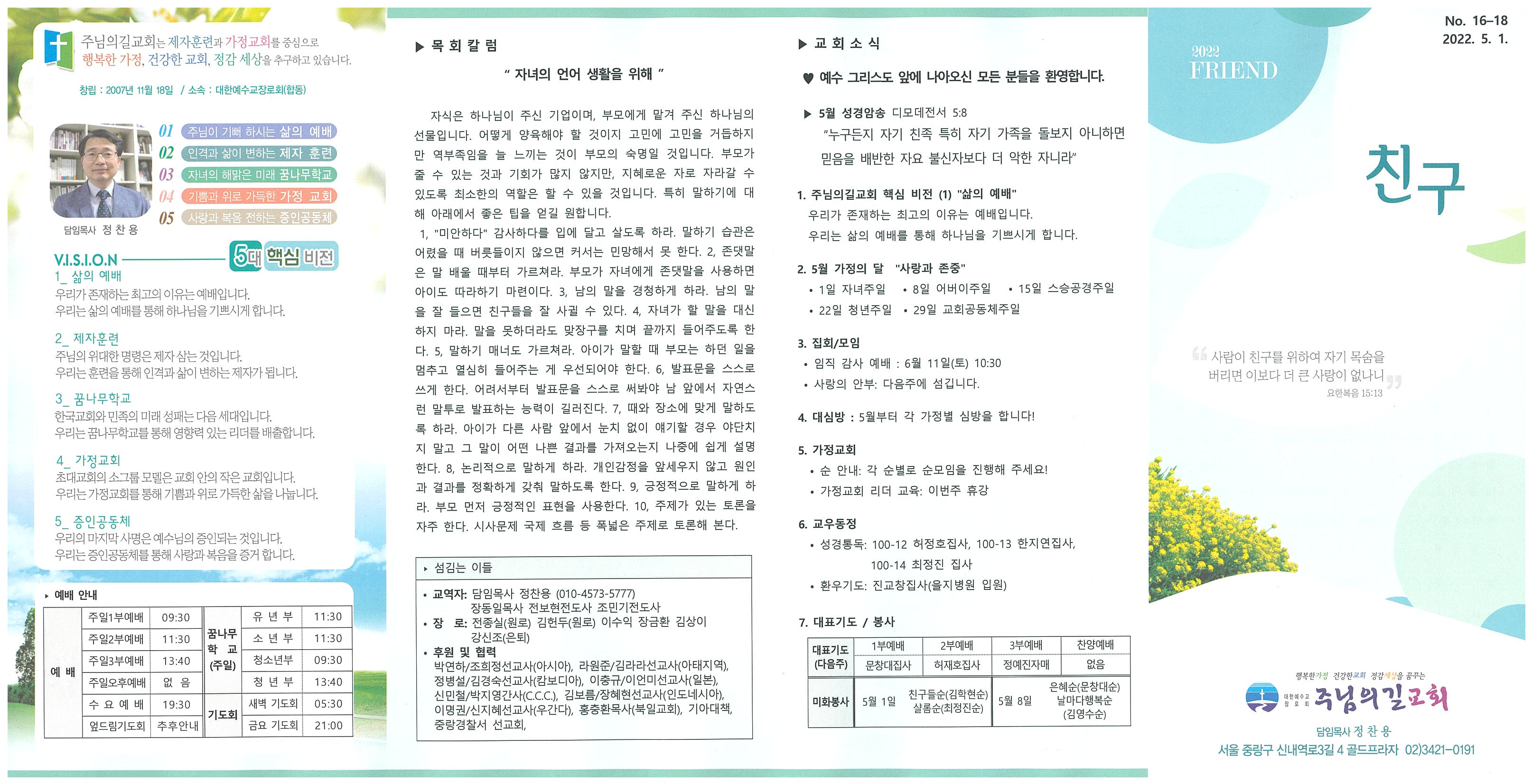 ♥ 예수 그리스도 앞에 나아오신 모든 분들을 환영합니다. ▶ 5월 성경암송 디모데전서 5:8 “누구든지 자기 친족 특히 자기 가족을 돌보지 아니하면 믿음을 배반한 자요 불신자보다 더 악한 자니라” 1. 주님의길교회 핵심 비전 (1) "삶의 예배" 우리가 존재하는 최고의 이유는 예배입니다. 우리는 삶의 예배를 통해 하나님을 기쁘시게 합니다. 2. 5월 가정의 달 "사랑과 존중" • 1일 자녀주일 • 8일 어버이주일 • 15일 스승공경주일 • 22일 청년주일 • 29일 교회공동체주일 3. 집회/모임 • 임직 감사 예배 : 6월 11일(토) 10:30 • 사랑의 안부: 다음주에 섬깁니다. 4. 대심방 : 5월부터 각 가정별 심방을 합니다! 5. 가정교회 • 순 안내: 각 순별로 순모임을 진행해 주세요! • 가정교회 리더 교육: 이번주 휴강 6. 교우동정 • 성경통독: 100-12 허정호집사, 100-13 한지연집사, 100-14 최정진 집사 • 환우기도: 진교창집사(을지병원 입원) |