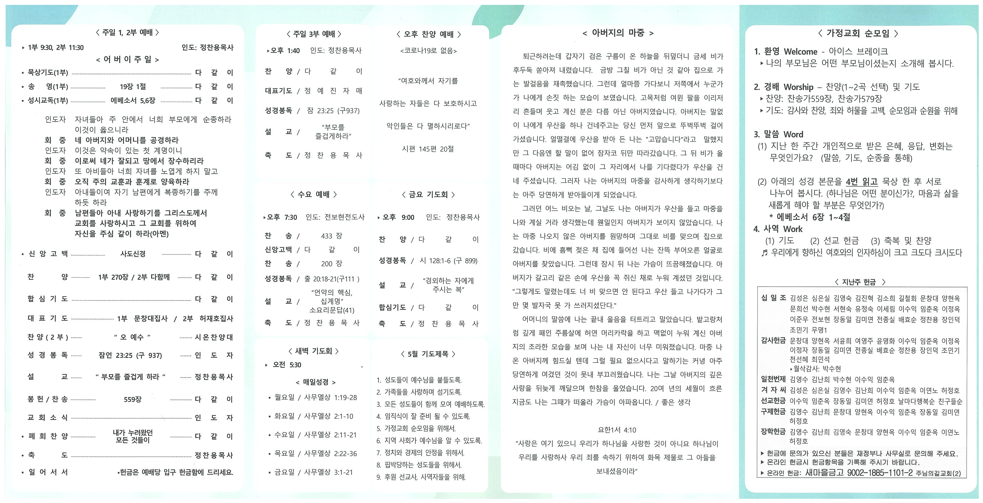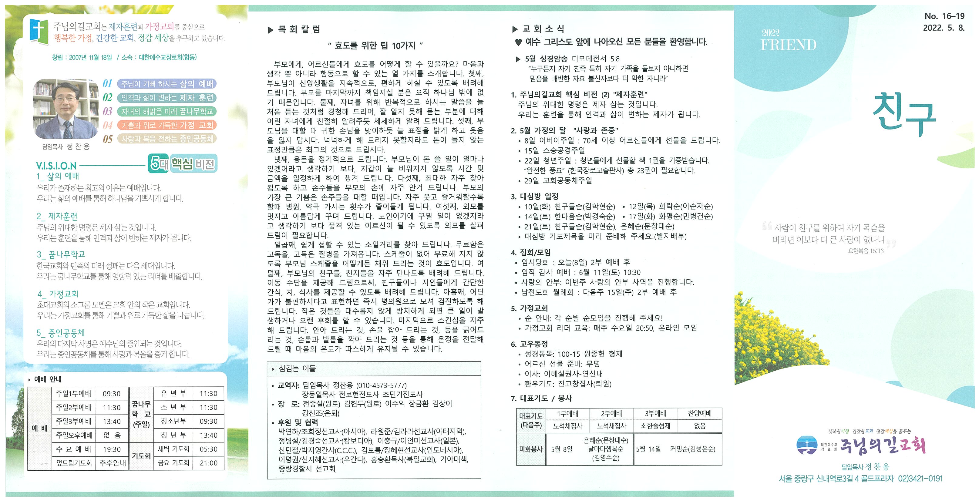 ♥ 예수 그리스도 앞에 나아오신 모든 분들을 환영합니다. ▶ 5월 성경암송 디모데전서 5:8 “누구든지 자기 친족 특히 자기 가족을 돌보지 아니하면 믿음을 배반한 자요 불신자보다 더 악한 자니라” 1. 주님의길교회 핵심 비전 (2) "제자훈련" 주님의 위대한 명령은 제자 삼는 것입니다. 우리는 훈련을 통해 인격과 삶이 변하는 제자가 됩니다. 2. 5월 가정의 달 "사랑과 존중" • 8일 어버이주일 : 70세 이상 어르신들에게 선물을 드립니다. • 15일 스승공경주일 • 22일 청년주일 : 청년들에게 선물할 책 1권을 기증받습니다. “완전한 풍요” (한국장로교출판사) 총 23권이 필요합니다. • 29일 교회공동체주일 3. 대심방 일정 • 10일(화) 친구들순(김학현순) • 12일(목) 희락순(이순자순) • 14일(토) 한마음순(박경숙순) • 17일(화) 화평순(민병건순) • 21일(토) 친구들순(김학현순), 은혜순(문창대순) • 대심방 기도제목을 미리 준배해 주세요!(별지배부) 4. 집회/모임 • 임시당회 : 오늘(8일) 2부 예배 후 • 임직 감사 예배 : 6월 11일(토) 10:30 • 사랑의 안부: 이번주 사랑의 안부 사역을 진행합니다. • 남전도회 월례회 : 다음주 15일(주) 2부 예배 후 5. 가정교회 • 순 안내: 각 순별 순모임을 진행해 주세요! • 가정교회 리더 교육: 매주 수요일 20:50, 온라인 모임 6. 교우동정 • 성경통독: 100-15 원종헌 형제 • 어르신 선물 준비: 무명 • 이사: 이해실권사-연신내 • 환우기도: 진교창집사(퇴원) |