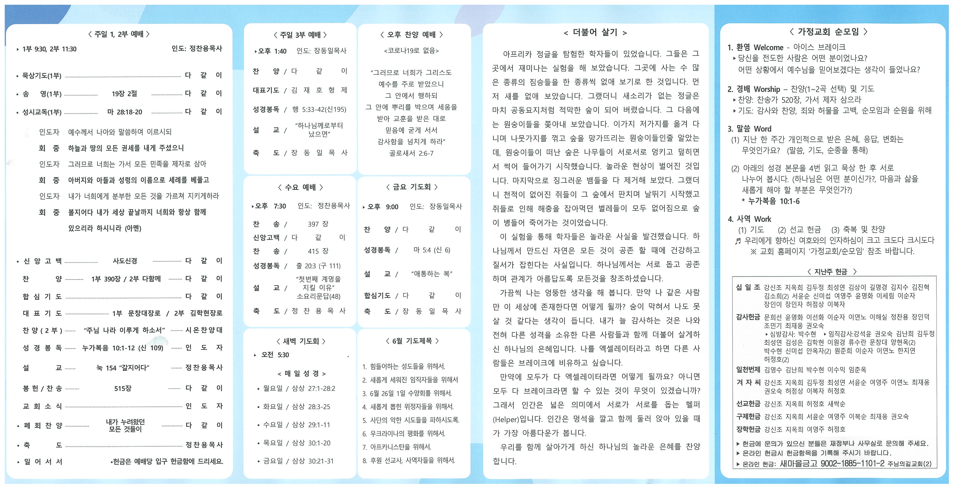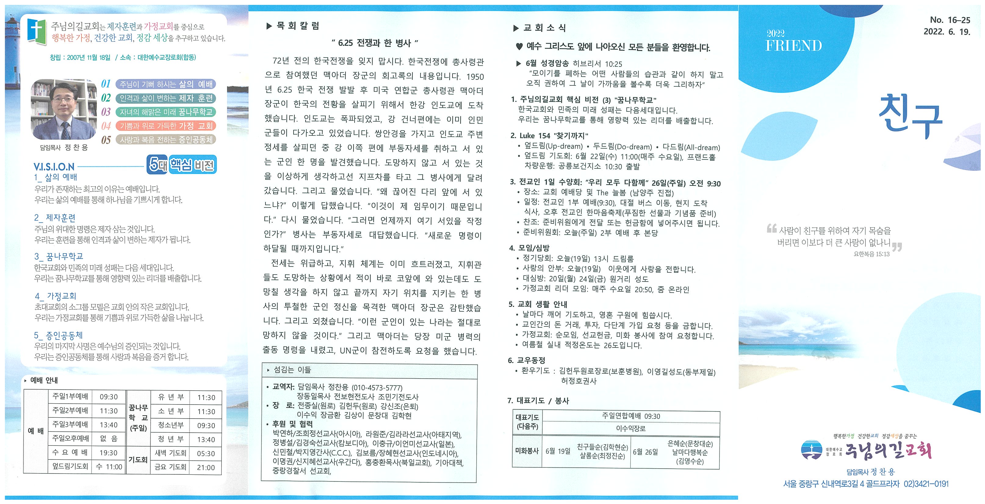 ♥ 예수 그리스도 앞에 나아오신 모든 분들을 환영합니다. ▶ 6월 성경암송 히브리서 10:25 “모이기를 폐하는 어떤 사람들의 습관과 같이 하지 말고 오직 권하여 그 날이 가까움을 볼수록 더욱 그리하자” 1. 주님의길교회 핵심 비전 (3) "꿈나무학교" 한국교회와 민족의 미래 성패는 다음세대입니다. 우리는 꿈나무학교를 통해 영향력 있는 리더를 배출합니다. 2. Luke 154 "찾기까지" • 엎드림(Up-dream) • 두드림(Do-dream) • 다드림(All-dream) • 엎드림 기도회: 6월 22일(수) 11:00(매주 수요일), 프랜드홀 차량운행: 공릉보건지소 10:30 출발 3. 전교인 1일 수양회: “우리 모두 다함께” 26일(주일) 오전 9:30 • 장소: 교회 예배당 및 The 늘봄 (남양주 진접) • 일정: 전교인 1부 예배(9:30), 대절 버스 이동, 현지 도착 식사, 오후 전교인 한마음축제(푸짐한 선물과 기념품 준비) • 찬조: 준비위원에게 전달 또는 헌금함에 넣어주시면 됩니다. • 준비위원회: 오늘(주일) 2부 예배 후 본당 4. 모임/심방 • 정기당회: 오늘(19일) 13시 드림룸 • 사랑의 안부: 오늘(19일) 이웃에게 사랑을 전합니다. • 대심방: 20일(월) 24일(금) 원거리 성도 • 가정교회 리더 모임: 매주 수요일 20:50, 줌 온라인 5. 교회 생활 안내 • 날마다 깨어 기도하고, 영혼 구원에 힘씁시다. • 교인간의 돈 거래, 투자, 다단계 가입 요청 등을 금합니다. • 가정교회: 순모임, 선교헌금, 미화 봉사에 참여 요청합니다. • 여름철 실내 적정온도는 26도입니다. 6. 교우동정 • 환우기도 : 김헌두원로장로(보훈병원), 이영길성도(동부제일) 허정호권사 |