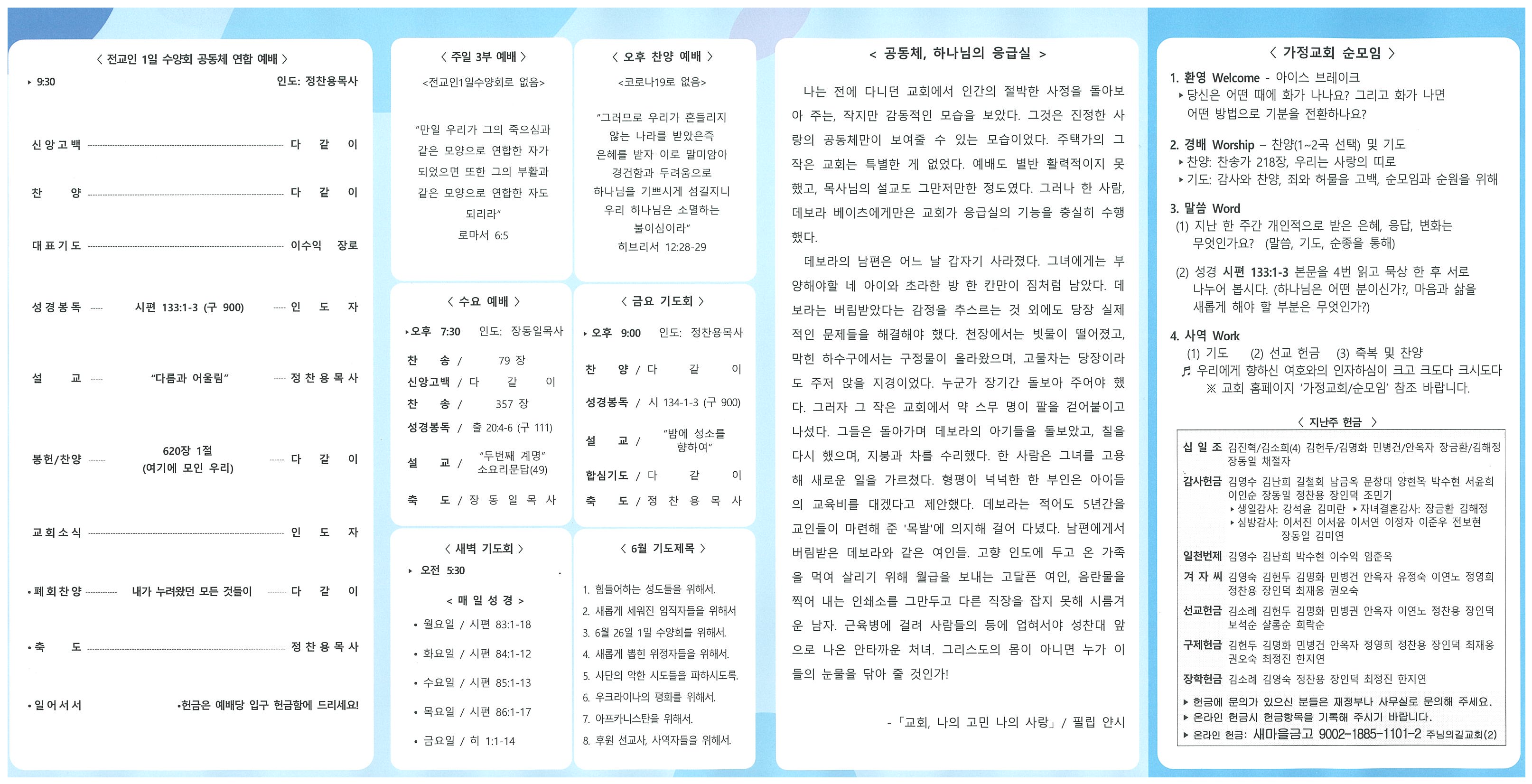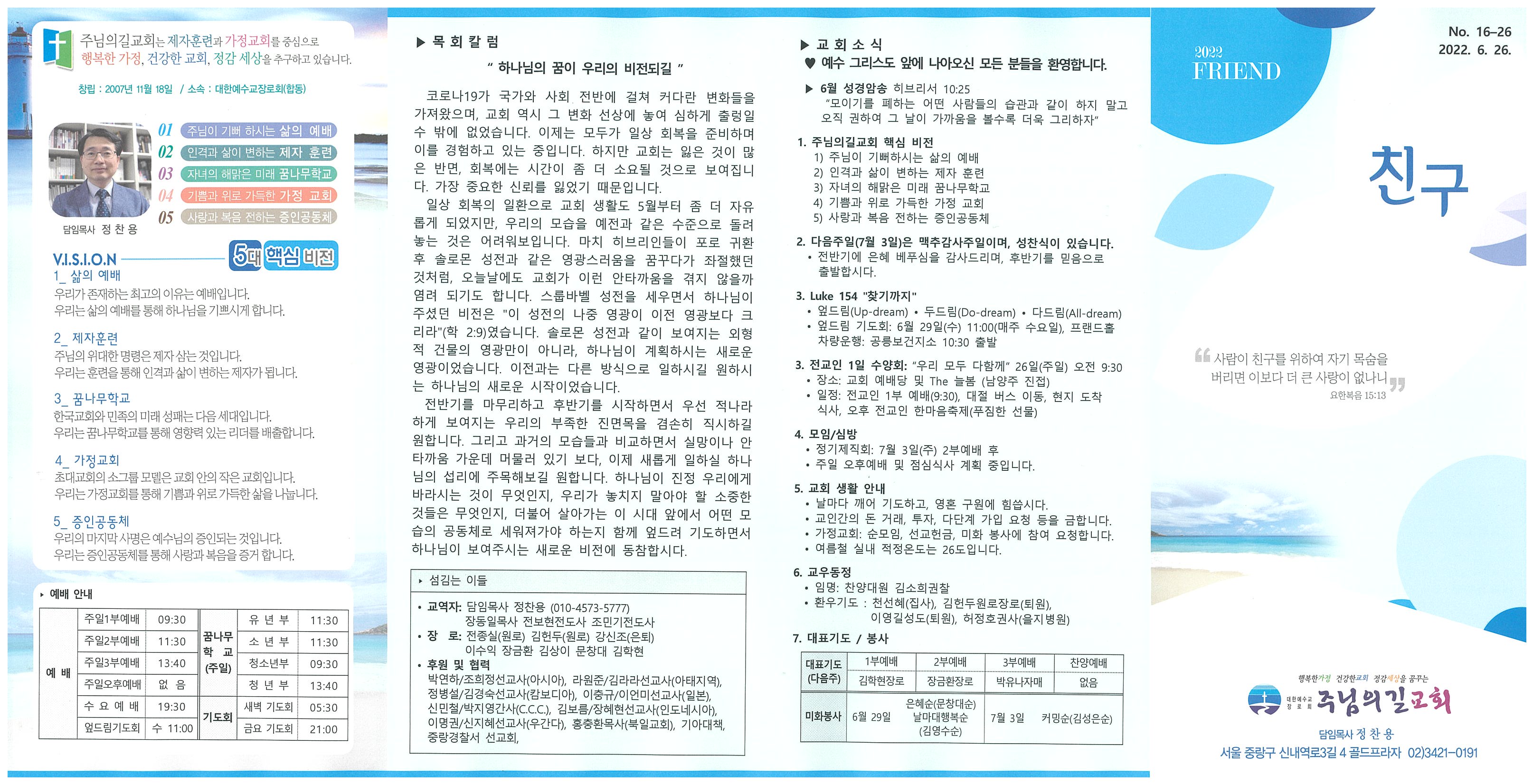 ♥ 예수 그리스도 앞에 나아오신 모든 분들을 환영합니다. ▶ 6월 성경암송 히브리서 10:25 “모이기를 폐하는 어떤 사람들의 습관과 같이 하지 말고 오직 권하여 그 날이 가까움을 볼수록 더욱 그리하자” 1. 주님의길교회 핵심 비전 1) 주님이 기뻐하시는 삶의 예배 2) 인격과 삶이 변하는 제자 훈련 3) 자녀의 해맑은 미래 꿈나무학교 4) 기쁨과 위로 가득한 가정 교회 5) 사랑과 복음 전하는 증인공동체 2. 다음주일(7월 3일)은 맥추감사주일이며, 성찬식이 있습니다. • 전반기에 은혜 베푸심을 감사드리며, 후반기를 믿음으로 출발합시다. 3. Luke 154 "찾기까지" • 엎드림(Up-dream) • 두드림(Do-dream) • 다드림(All-dream) • 엎드림 기도회: 6월 29일(수) 11:00(매주 수요일), 프랜드홀 차량운행: 공릉보건지소 10:30 출발 3. 전교인 1일 수양회: “우리 모두 다함께” 26일(주일) 오전 9:30 • 장소: 교회 예배당 및 The 늘봄 (남양주 진접) • 일정: 전교인 1부 예배(9:30), 대절 버스 이동, 현지 도착 식사, 오후 전교인 한마음축제(푸짐한 선물) 4. 모임/심방 • 정기제직회: 7월 3일(주) 2부예배 후 • 주일 오후예배 및 점심식사 계획 중입니다. 5. 교회 생활 안내 • 날마다 깨어 기도하고, 영혼 구원에 힘씁시다. • 교인간의 돈 거래, 투자, 다단계 가입 요청 등을 금합니다. • 가정교회: 순모임, 선교헌금, 미화 봉사에 참여 요청합니다. • 여름철 실내 적정온도는 26도입니다. 6. 교우동정 • 임명: 찬양대원 김소희권찰 • 환우기도 : 천선혜(집사), 김헌두원로장로(퇴원), 이영길성도(퇴원), 허정호권사(을지병원) |