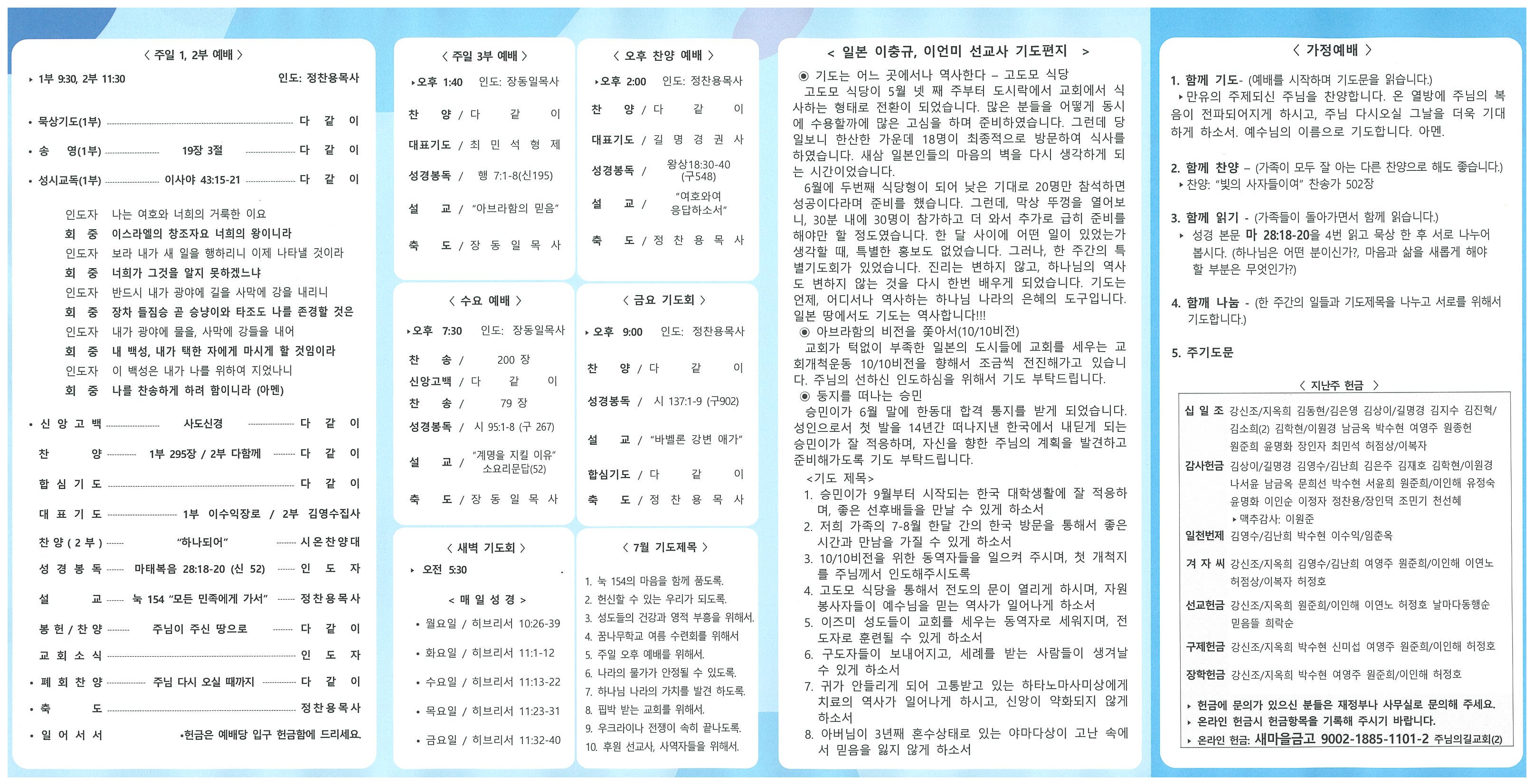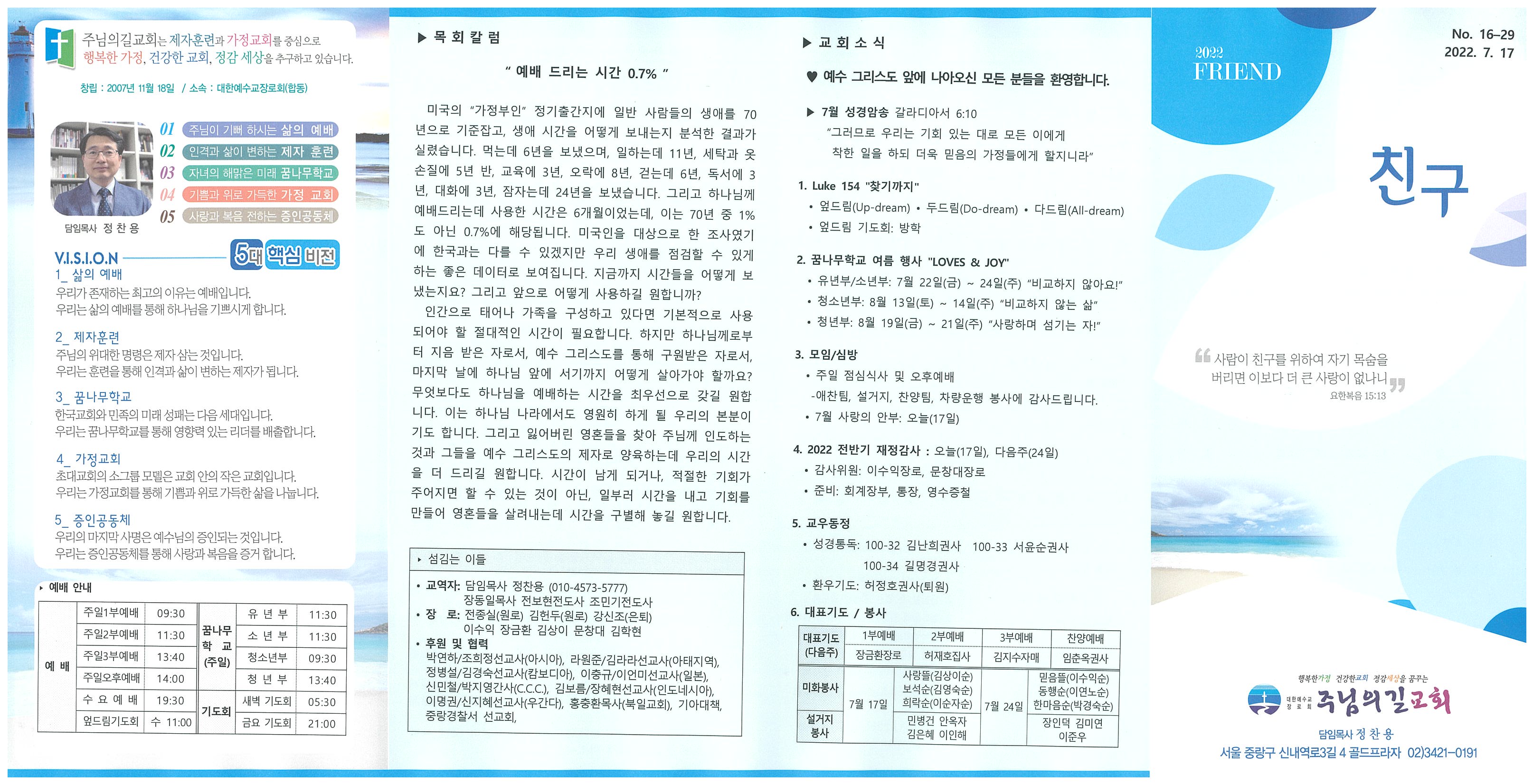 ♥ 예수 그리스도 앞에 나아오신 모든 분들을 환영합니다. ▶ 7월 성경암송 갈라디아서 6:10 “그러므로 우리는 기회 있는 대로 모든 이에게 착한 일을 하되 더욱 믿음의 가정들에게 할지니라” 1. Luke 154 "찾기까지" • 엎드림(Up-dream) • 두드림(Do-dream) • 다드림(All-dream) • 엎드림 기도회: 방학 2. 꿈나무학교 여름 행사 "LOVES & JOY" • 유년부/소년부: 7월 22일(금) ~ 24일(주) “비교하지 않아요!” • 청소년부: 8월 13일(토) ~ 14일(주) “비교하지 않는 삶” • 청년부: 8월 19일(금) ~ 21일(주) “사랑하며 섬기는 자!” 3. 모임/심방 • 주일 점심식사 및 오후예배 -애찬팀, 설거지, 찬양팀, 차량운행 봉사에 감사드립니다. • 7월 사랑의 안부: 오늘(17일) 4. 2022 전반기 재정감사 : 오늘(17일), 다음주(24일) • 감사위원: 이수익장로, 문창대장로 • 준비: 회계장부, 통장, 영수증철 5. 교우동정 • 성경통독: 100-32 김난희권사 100-33 서윤순권사 100-34 길명경권사 • 환우기도: 허정호권사(퇴원) |