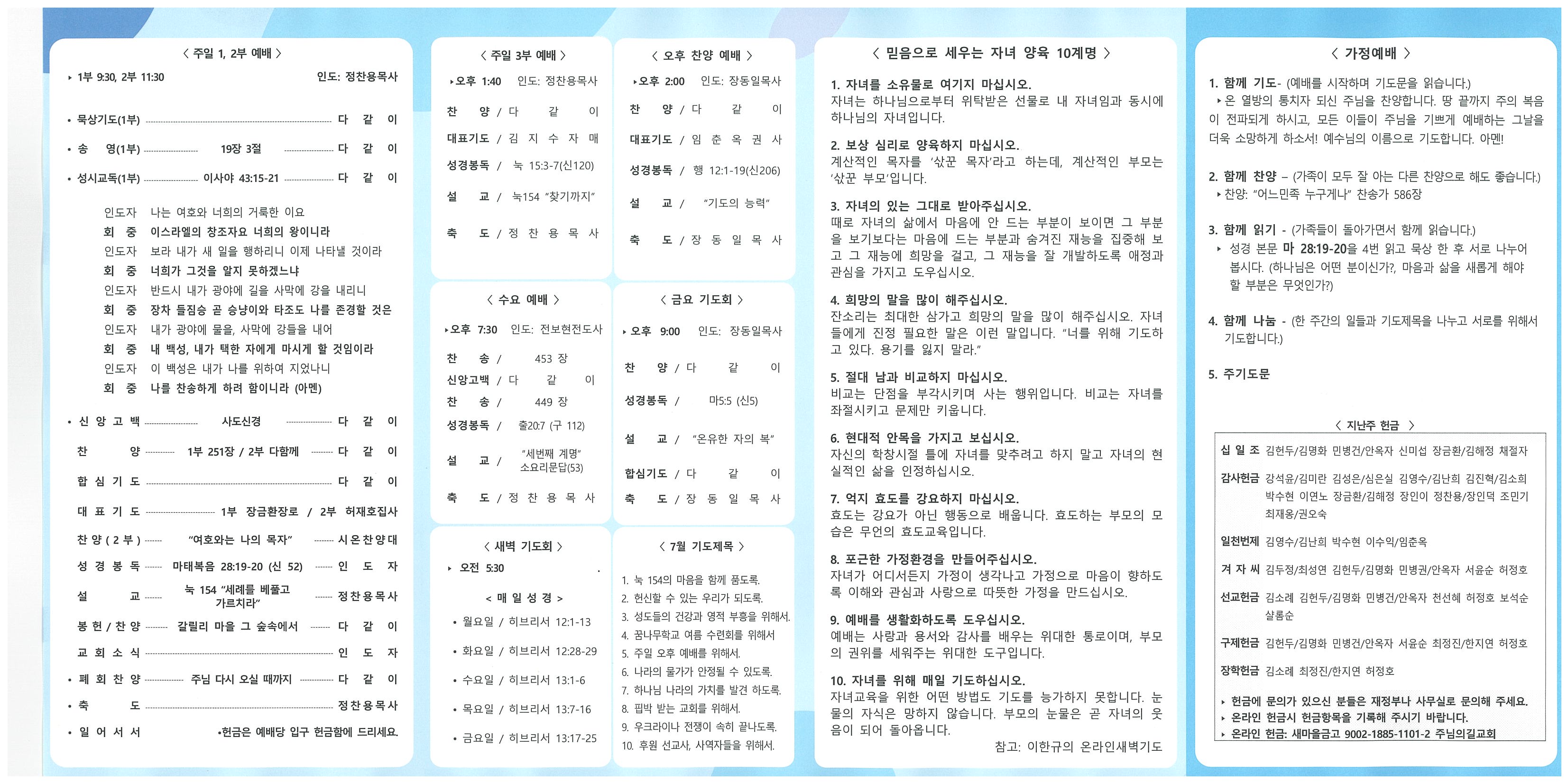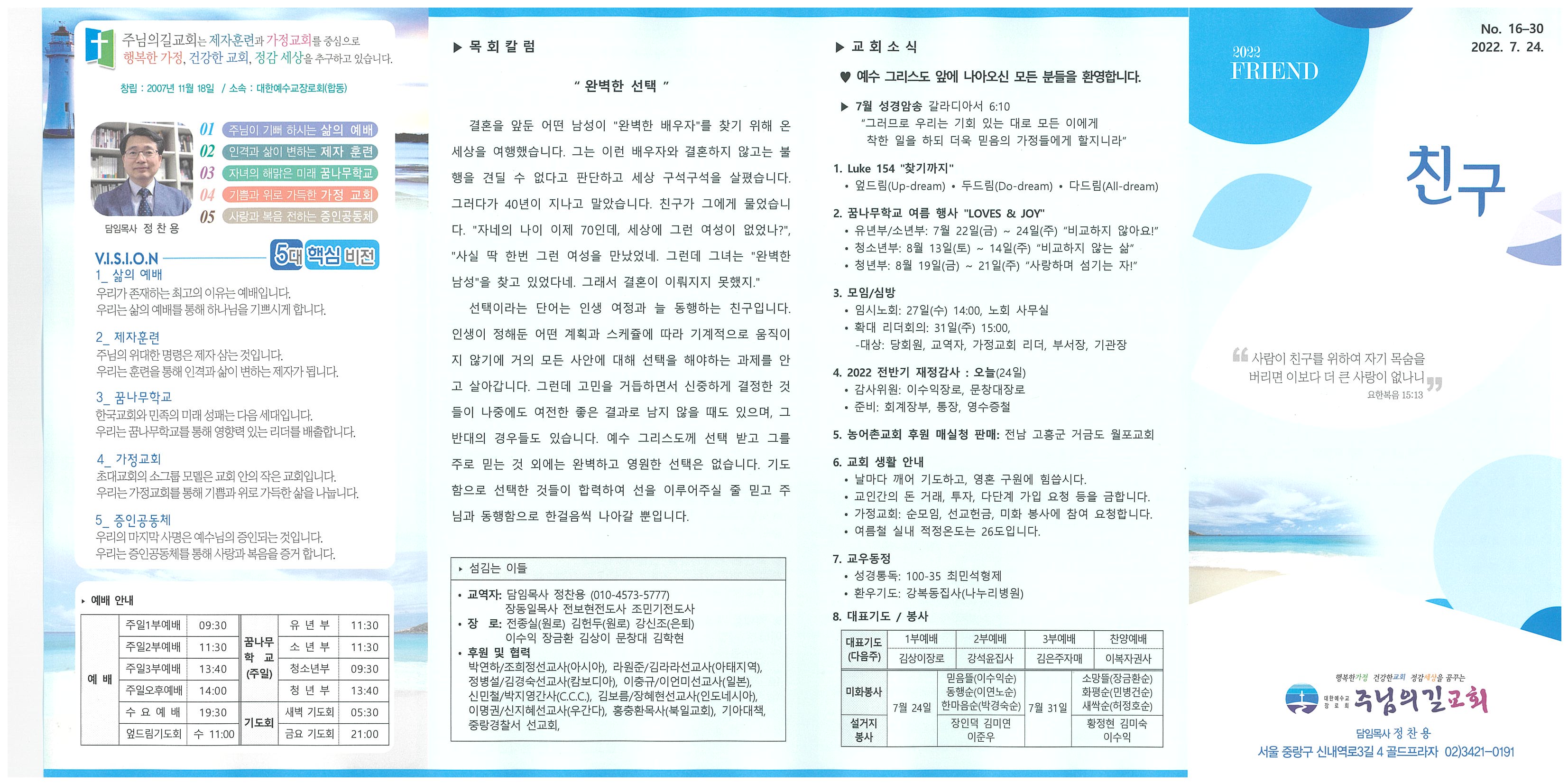 ♥ 예수 그리스도 앞에 나아오신 모든 분들을 환영합니다. ▶ 7월 성경암송 갈라디아서 6:10 “그러므로 우리는 기회 있는 대로 모든 이에게 착한 일을 하되 더욱 믿음의 가정들에게 할지니라” 1. Luke 154 "찾기까지" • 엎드림(Up-dream) • 두드림(Do-dream) • 다드림(All-dream) 2. 꿈나무학교 여름 행사 "LOVES & JOY" • 유년부/소년부: 7월 22일(금) ~ 24일(주) “비교하지 않아요!” • 청소년부: 8월 13일(토) ~ 14일(주) “비교하지 않는 삶” • 청년부: 8월 19일(금) ~ 21일(주) “사랑하며 섬기는 자!” 3. 모임/심방 • 임시노회: 27일(수) 14:00, 노회 사무실 • 확대 리더회의: 31일(주) 15:00, -대상: 당회원, 교역자, 가정교회 리더, 부서장, 기관장 4. 2022 전반기 재정감사 : 오늘(24일) • 감사위원: 이수익장로, 문창대장로 • 준비: 회계장부, 통장, 영수증철 5. 농어촌교회 후원 매실청 판매: 전남 고흥군 거금도 월포교회 6. 교회 생활 안내 • 날마다 깨어 기도하고, 영혼 구원에 힘씁시다. • 교인간의 돈 거래, 투자, 다단계 가입 요청 등을 금합니다. • 가정교회: 순모임, 선교헌금, 미화 봉사에 참여 요청합니다. • 여름철 실내 적정온도는 26도입니다. 7. 교우동정 • 성경통독: 100-35 최민석형제 • 환우기도: 강복동집사(나누리병원) |