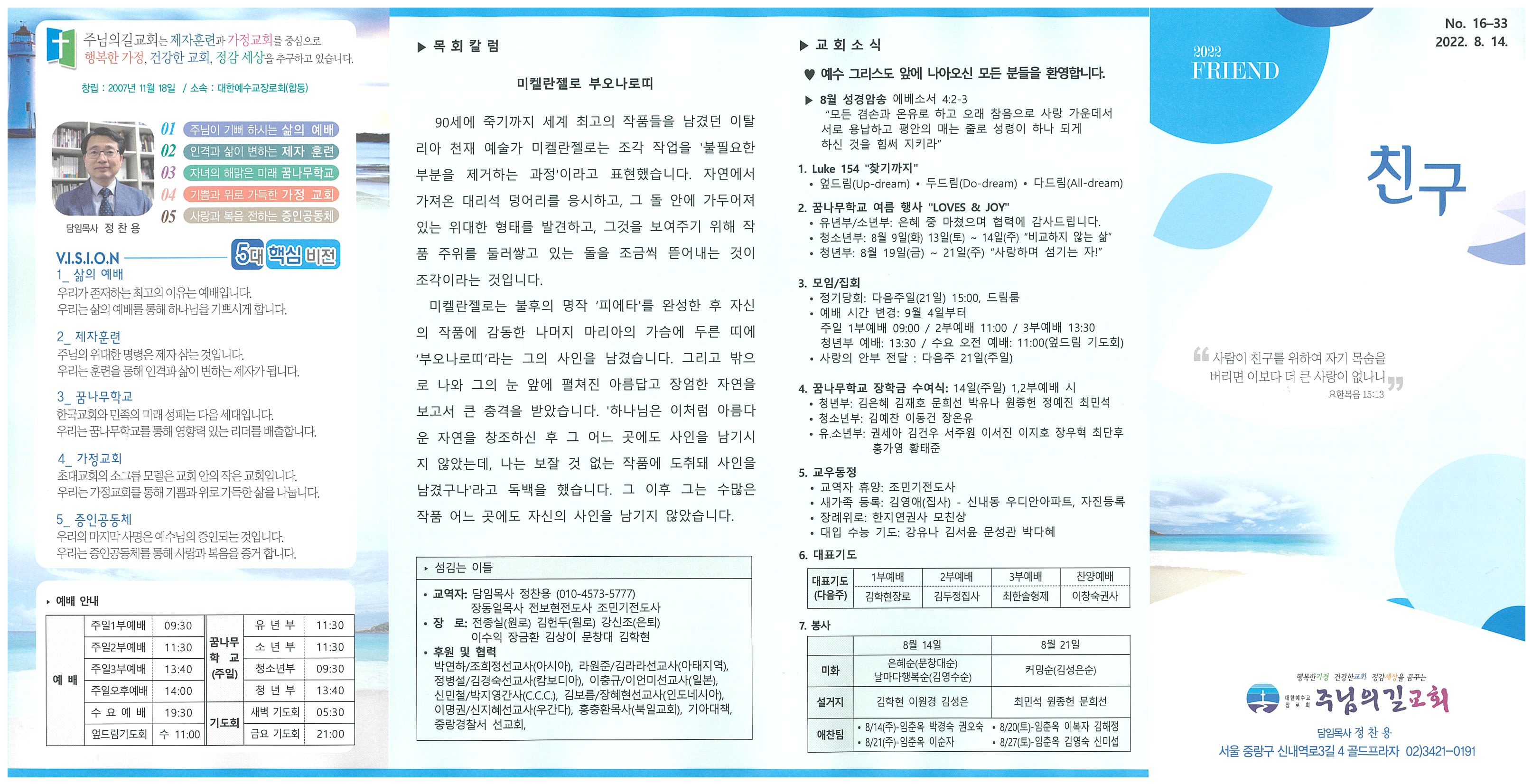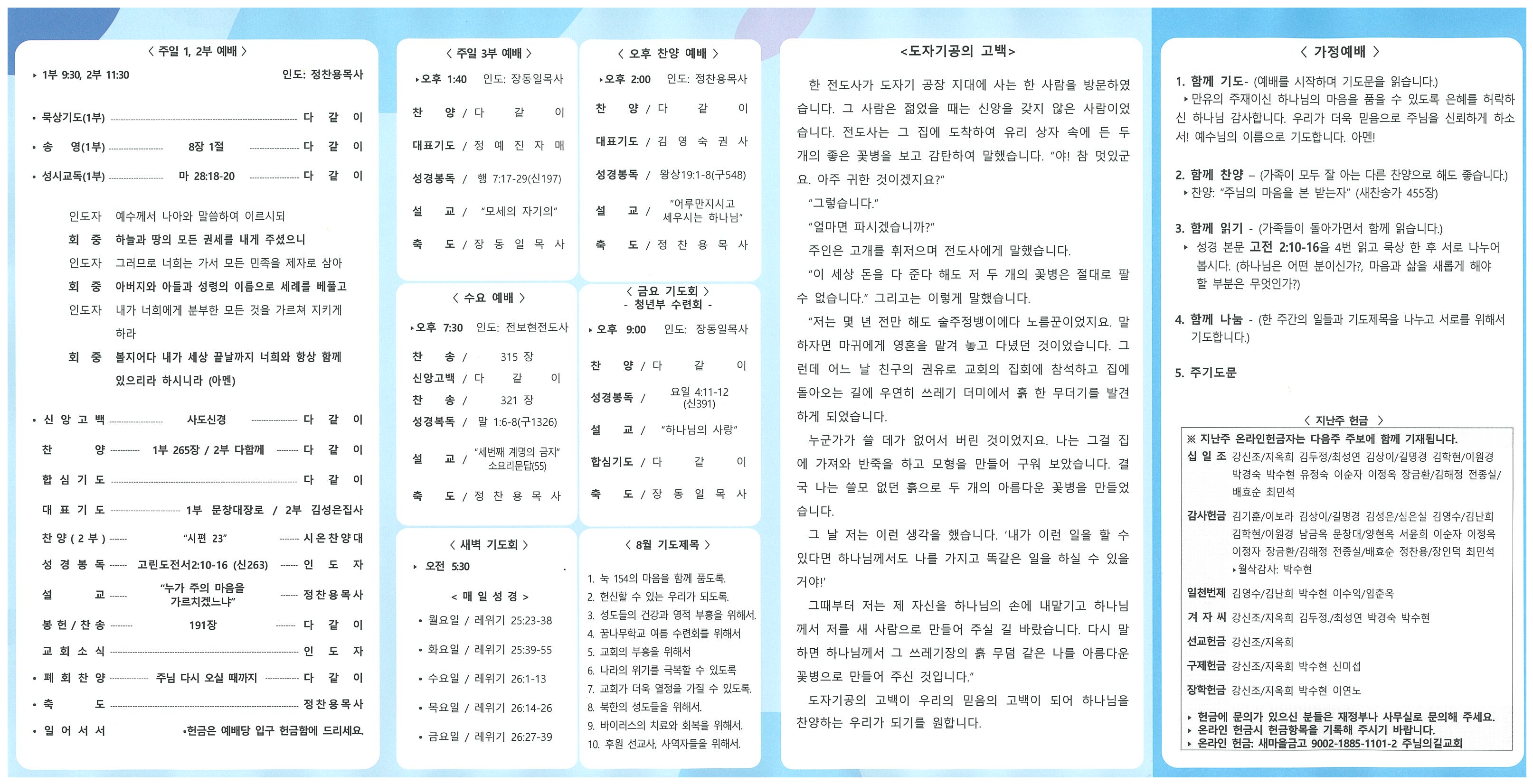 ♥ 예수 그리스도 앞에 나아오신 모든 분들을 환영합니다. ▶ 8월 성경암송 에베소서 4:2-3 “모든 겸손과 온유로 하고 오래 참음으로 사랑 가운데서 서로 용납하고 평안의 매는 줄로 성령이 하나 되게 하신 것을 힘써 지키라” 1. Luke 154 "찾기까지" • 엎드림(Up-dream) • 두드림(Do-dream) • 다드림(All-dream) 2. 꿈나무학교 여름 행사 "LOVES & JOY" • 유년부/소년부: 은혜 중 마쳤으며 협력에 감사드립니다. • 청소년부: 8월 9일(화) 13일(토) ~ 14일(주) “비교하지 않는 삶” • 청년부: 8월 19일(금) ~ 21일(주) “사랑하며 섬기는 자!” 3. 모임/집회 • 정기당회: 다음주일(21일) 15:00, 드림룸 • 예배 시간 변경: 9월 4일부터 주일 1부예배 09:00 / 2부예배 11:00 / 3부예배 13:30 청년부 예배: 13:30 / 수요 오전 예배: 11:00(엎드림 기도회) • 사랑의 안부 전달 : 다음주 21일(주일) 4. 꿈나무학교 장학금 수여식: 14일(주일) 1,2부예배 시 • 청년부: 김은혜 김재호 문희선 박유나 원종헌 정예진 최민석 • 청소년부: 김예찬 이동건 장온유 • 유.소년부: 권세아 김건우 서주원 이서진 이지호 장우혁 최단후 홍가영 황태준 5. 교우동정 • 교역자 휴양: 조민기전도사 • 새가족 등록: 김영애(집사) - 신내동 우디안아파트, 자진등록 • 장례위로: 한지연권사 모친상 • 대입 수능 기도: 강유나 김서윤 문성관 박다혜 |