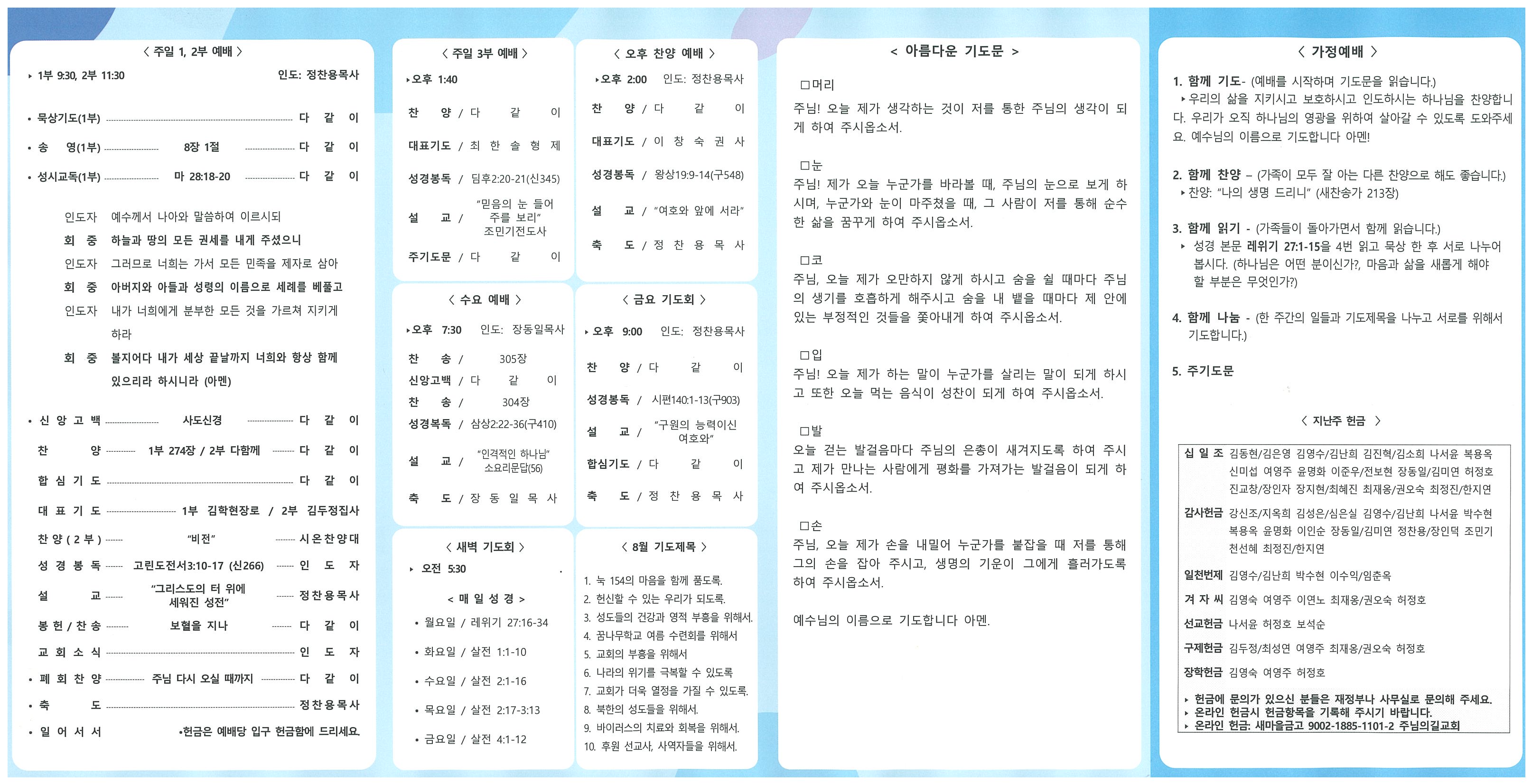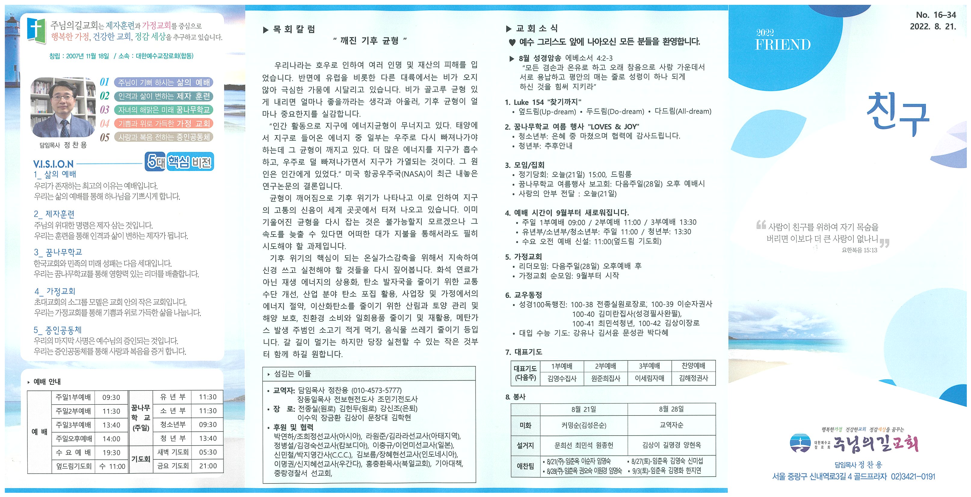 ♥ 예수 그리스도 앞에 나아오신 모든 분들을 환영합니다. ▶ 8월 성경암송 에베소서 4:2-3 “모든 겸손과 온유로 하고 오래 참음으로 사랑 가운데서 서로 용납하고 평안의 매는 줄로 성령이 하나 되게 하신 것을 힘써 지키라” 1. Luke 154 "찾기까지" • 엎드림(Up-dream) • 두드림(Do-dream) • 다드림(All-dream) 2. 꿈나무학교 여름 행사 "LOVES & JOY" • 청소년부: 은혜 중 마쳤으며 협력에 감사드립니다. • 청년부: 추후안내 3. 모임/집회 • 정기당회: 오늘(21일) 15:00, 드림룸 • 꿈나무학교 여름행사 보고회: 다음주일(28일) 오후 예배시 • 사랑의 안부 전달 : 오늘(21일) 4. 예배 시간이 9월부터 새로워집니다. • 주일 1부예배 09:00 / 2부예배 11:00 / 3부예배 13:30 • 유년부/소년부/청소년부: 주일 11:00 / 청년부: 13:30 • 수요 오전 예배 신설: 11:00(엎드림 기도회) 5. 가정교회 • 리더모임: 다음주일(28일) 오후예배 후 • 가정교회 순모임: 9월부터 시작 6. 교우동정 • 성경100독행진: 100-38 전종실원로장로, 100-39 이순자권사 100-40 김미란집사(성경필사완필), 100-41 최민석청년, 100-42 김상이장로 • 대입 수능 기도: 강유나 김서윤 문성관 박다혜 |