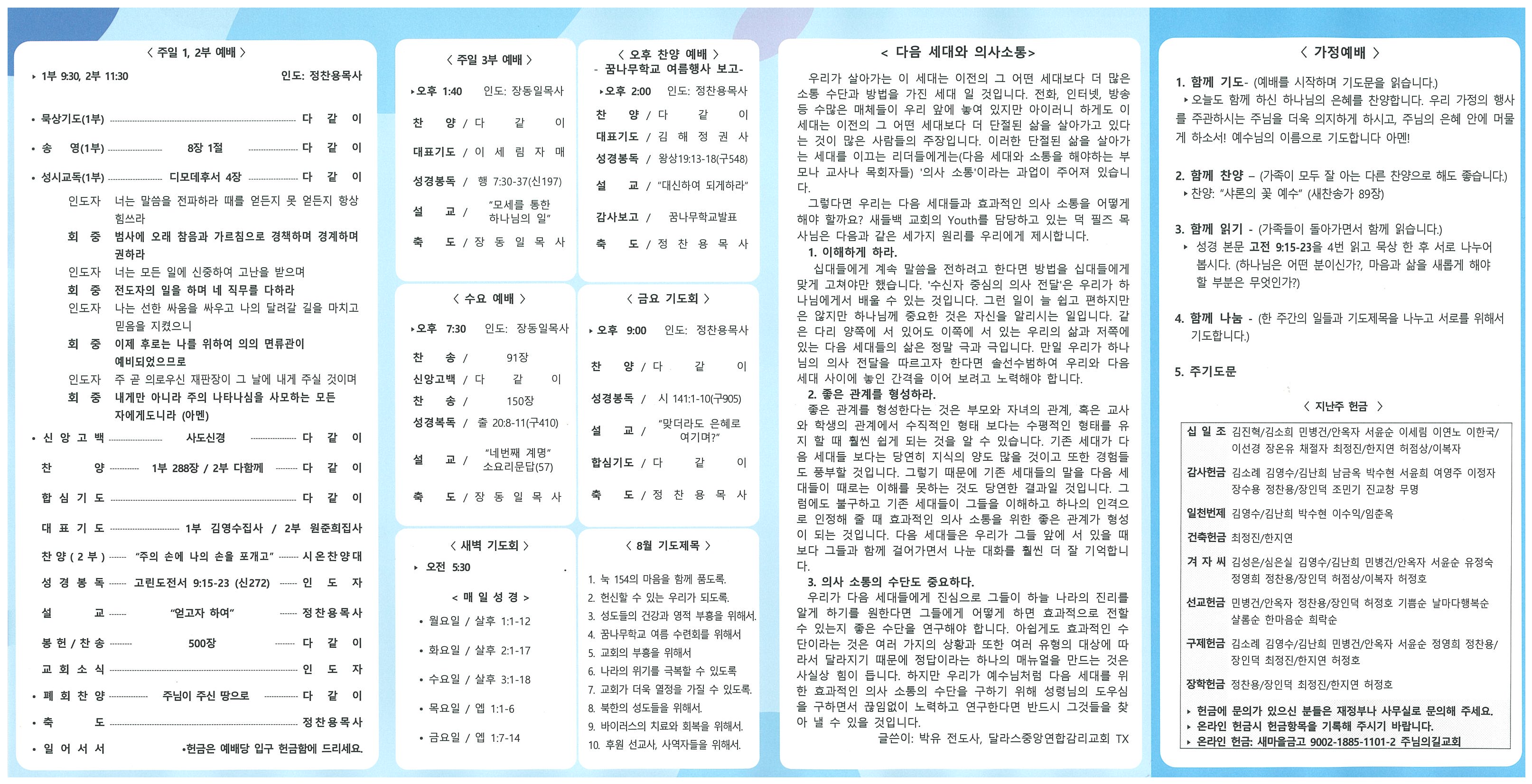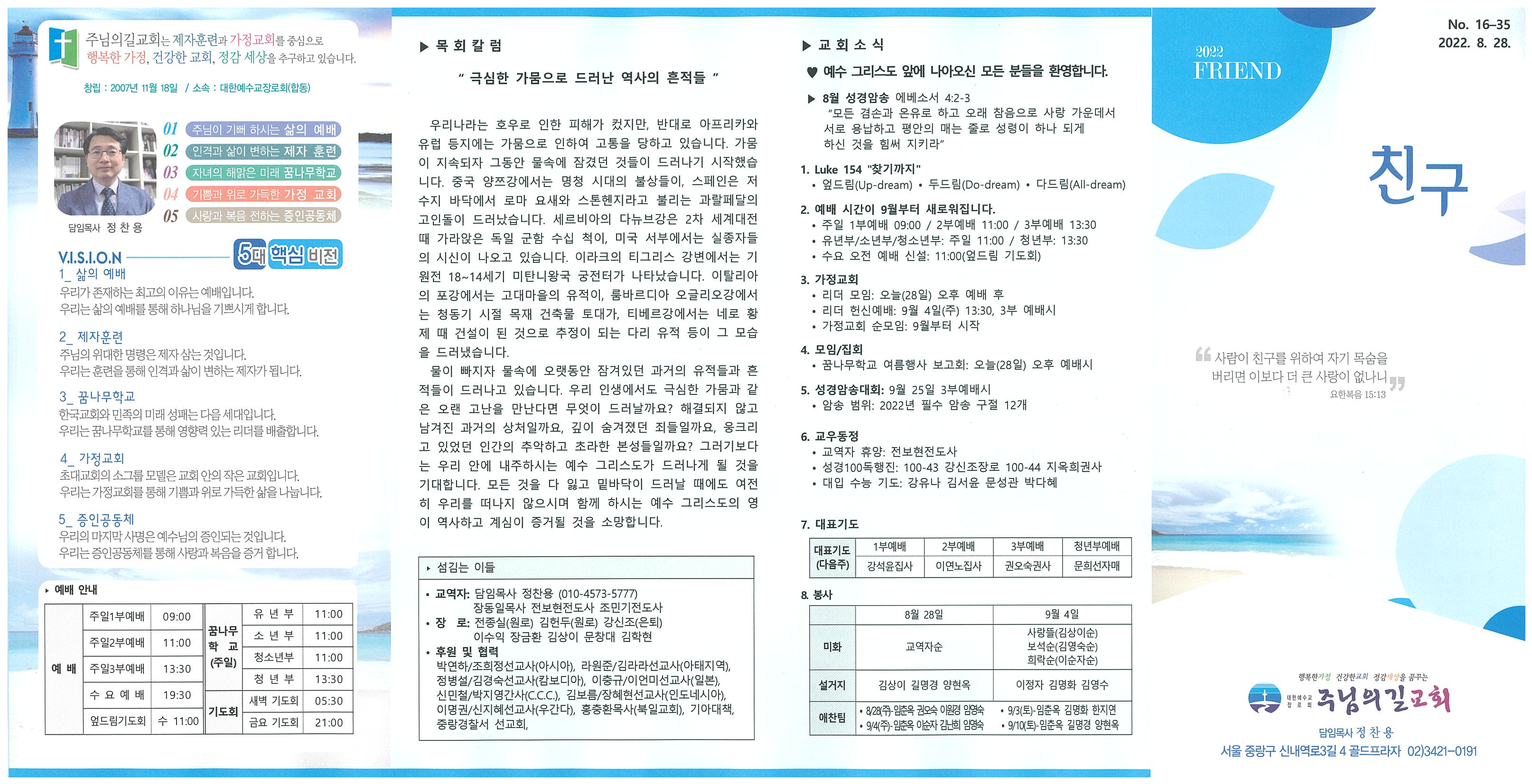 ♥ 예수 그리스도 앞에 나아오신 모든 분들을 환영합니다. ▶ 8월 성경암송 에베소서 4:2-3 “모든 겸손과 온유로 하고 오래 참음으로 사랑 가운데서 서로 용납하고 평안의 매는 줄로 성령이 하나 되게 하신 것을 힘써 지키라” 1. Luke 154 "찾기까지" • 엎드림(Up-dream) • 두드림(Do-dream) • 다드림(All-dream) 2. 예배 시간이 9월부터 새로워집니다. • 주일 1부예배 09:00 / 2부예배 11:00 / 3부예배 13:30 • 유년부/소년부/청소년부: 주일 11:00 / 청년부: 13:30 • 수요 오전 예배 신설: 11:00(엎드림 기도회) 3. 가정교회 • 리더 모임: 오늘(28일) 오후 예배 후 • 리더 헌신예배: 9월 4일(주) 13:30, 3부 예배시 • 가정교회 순모임: 9월부터 시작 4. 모임/집회 • 꿈나무학교 여름행사 보고회: 오늘(28일) 오후 예배시 5. 성경암송대회: 9월 25일 3부예배시 • 암송 범위: 2022년 필수 암송 구절 12개 6. 교우동정 • 교역자 휴양: 전보현전도사 • 성경100독행진: 100-43 강신조장로 100-44 지옥희권사 • 대입 수능 기도: 강유나 김서윤 문성관 박다혜 |