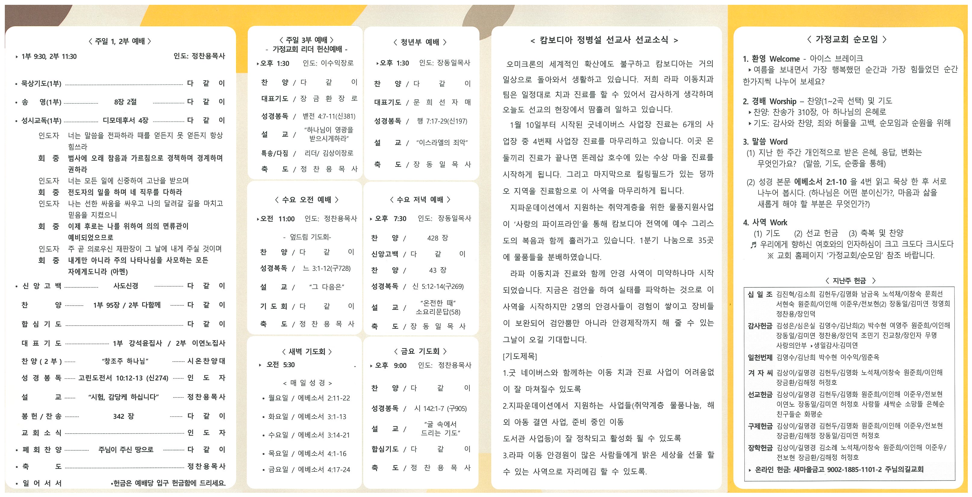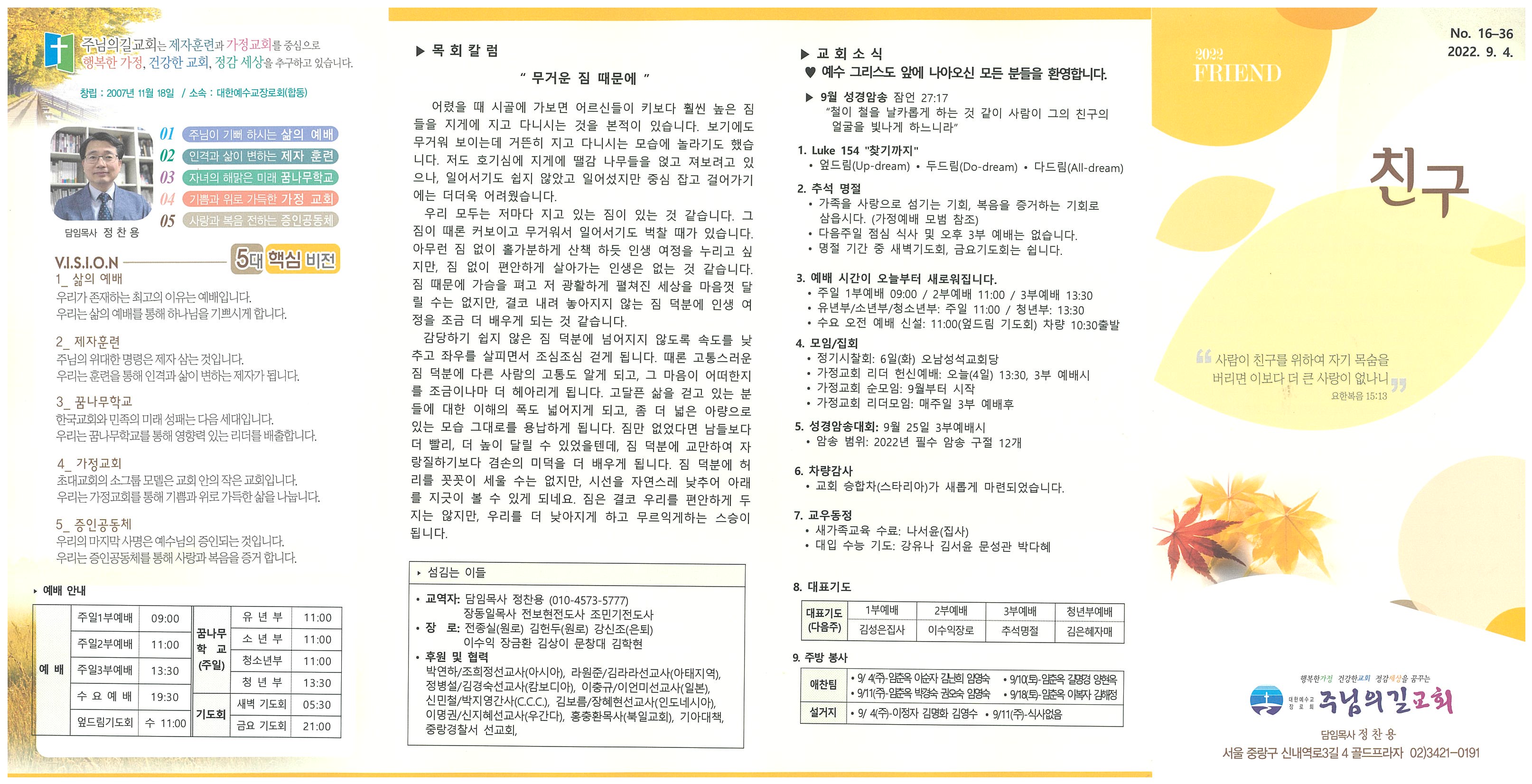 ♥ 예수 그리스도 앞에 나아오신 모든 분들을 환영합니다. ▶ 9월 성경암송 잠언 27:17 “철이 철을 날카롭게 하는 것 같이 사람이 그의 친구의 얼굴을 빛나게 하느니라” 1. Luke 154 "찾기까지" • 엎드림(Up-dream) • 두드림(Do-dream) • 다드림(All-dream) 2. 추석 명절 • 가족을 사랑으로 섬기는 기회, 복음을 증거하는 기회로 삼읍시다. (가정예배 모범 참조) • 다음주일 점심 식사 및 오후 3부 예배는 없습니다. • 명절 기간 중 새벽기도회, 금요기도회는 쉽니다. 3. 예배 시간이 오늘부터 새로워집니다. • 주일 1부예배 09:00 / 2부예배 11:00 / 3부예배 13:30 • 유년부/소년부/청소년부: 주일 11:00 / 청년부: 13:30 • 수요 오전 예배 신설: 11:00(엎드림 기도회) 차량 10:30출발 4. 모임/집회 • 정기시찰회: 6일(화) 오남성석교회당 • 가정교회 리더 헌신예배: 오늘(4일) 13:30, 3부 예배시 • 가정교회 순모임: 9월부터 시작 • 가정교회 리더모임: 매주일 3부 예배후 5. 성경암송대회: 9월 25일 3부예배시 • 암송 범위: 2022년 필수 암송 구절 12개 6. 차량감사 • 교회 승합차(스타리아)가 새롭게 마련되었습니다. 7. 교우동정 • 새가족교육 수료: 나서윤(집사) • 대입 수능 기도: 강유나 김서윤 문성관 박다혜 |
