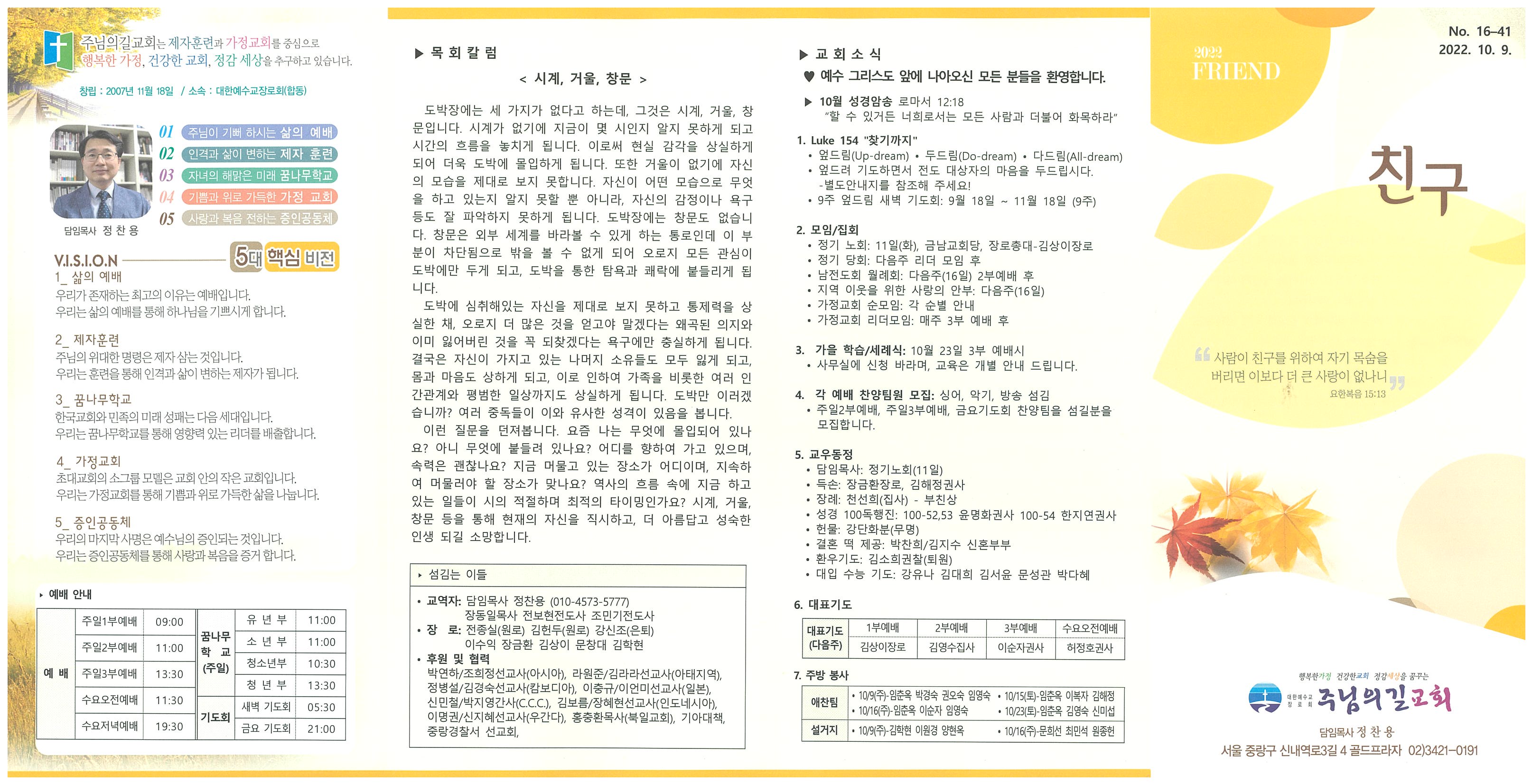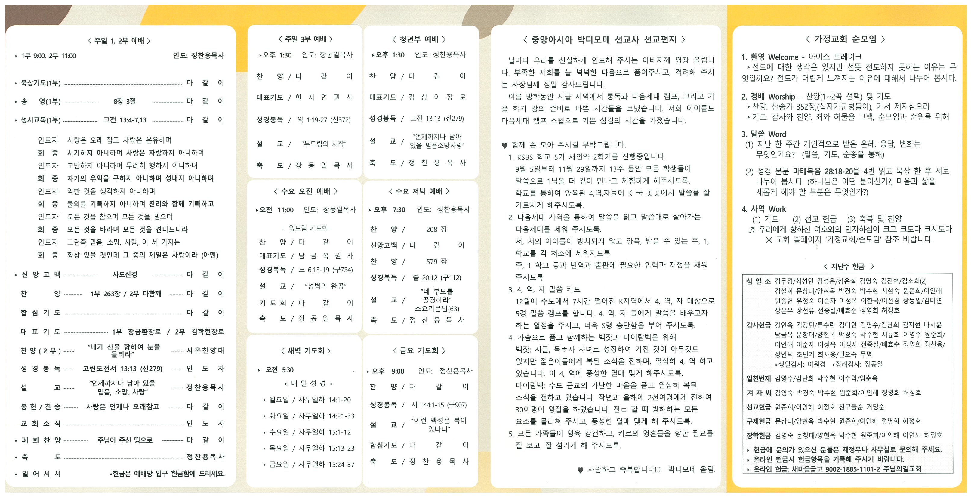 ♥ 예수 그리스도 앞에 나아오신 모든 분들을 환영합니다. ▶ 10월 성경암송 로마서 12:18 “할 수 있거든 너희로서는 모든 사람과 더불어 화목하라” 1. Luke 154 "찾기까지" • 엎드림(Up-dream) • 두드림(Do-dream) • 다드림(All-dream) • 엎드려 기도하면서 전도 대상자의 마음을 두드립시다. -별도안내지를 참조해 주세요! • 9주 엎드림 새벽 기도회: 9월 18일 ~ 11월 18일 (9주) 2. 모임/집회 • 정기 노회: 11일(화), 금남교회당, 장로총대-김상이장로 • 정기 당회: 다음주 리더 모임 후 • 남전도회 월례회: 다음주(16일) 2부예배 후 • 지역 이웃을 위한 사랑의 안부: 다음주(16일) • 가정교회 순모임: 각 순별 안내 • 가정교회 리더모임: 매주 3부 예배 후 3. 가을 학습/세례식: 10월 23일 3부 예배시 • 사무실에 신청 바라며, 교육은 개별 안내 드립니다. 4. 각 예배 찬양팀원 모집: 싱어, 악기, 방송 섬김 • 주일2부예배, 주일3부예배, 금요기도회 찬양팀을 섬길분을 모집합니다. 5. 교우동정 • 담임목사: 정기노회(11일) • 득손: 장금환장로, 김해정권사 • 장례: 천선희(집사) - 부친상 • 성경 100독행진: 100-52,53 윤명화권사 100-54 한지연권사 • 헌물: 강단화분(무명) • 결혼 떡 제공: 박찬희/김지수 신혼부부 • 환우기도: 김소희권찰(퇴원) • 대입 수능 기도: 강유나 김대희 김서윤 문성관 박다혜 |