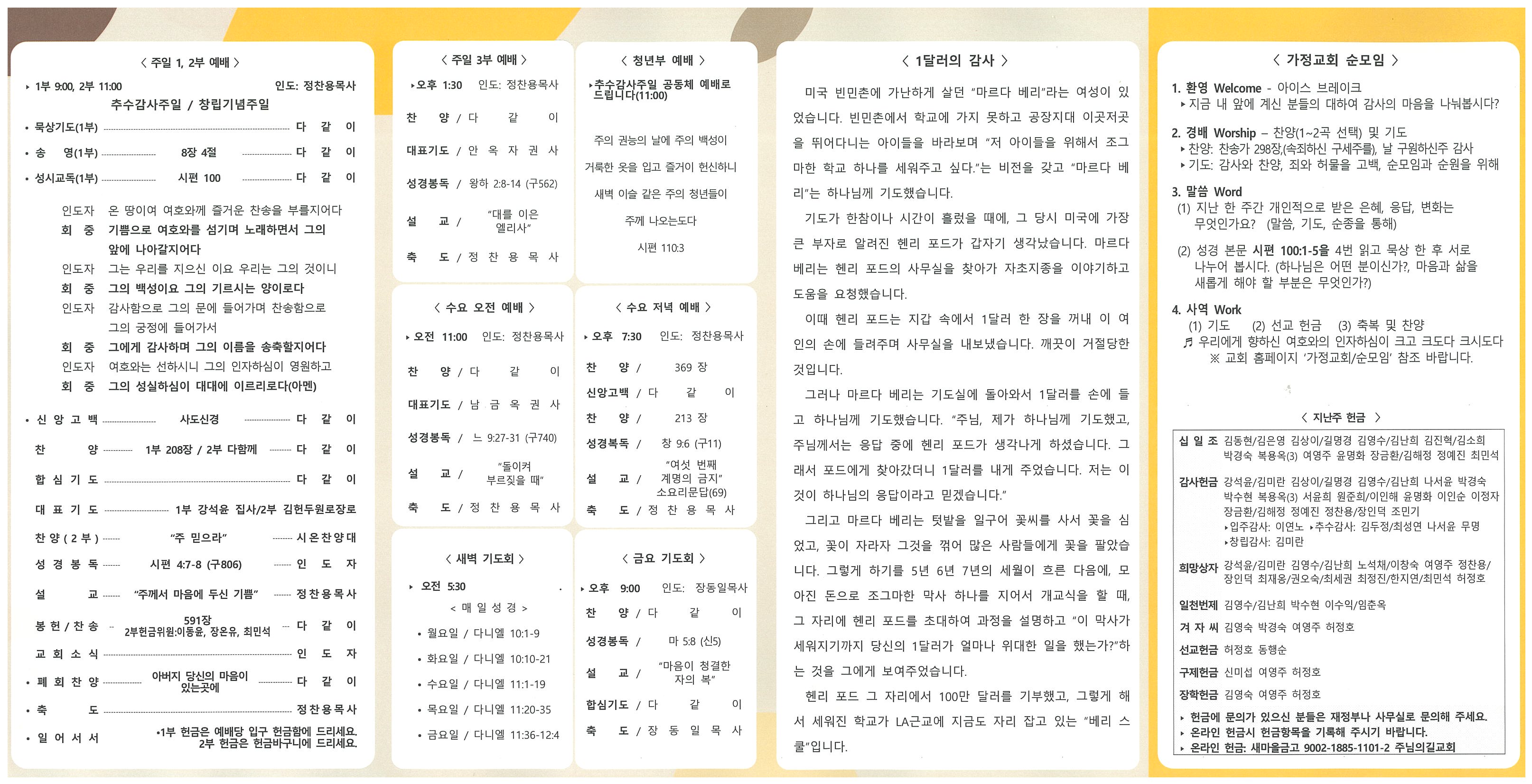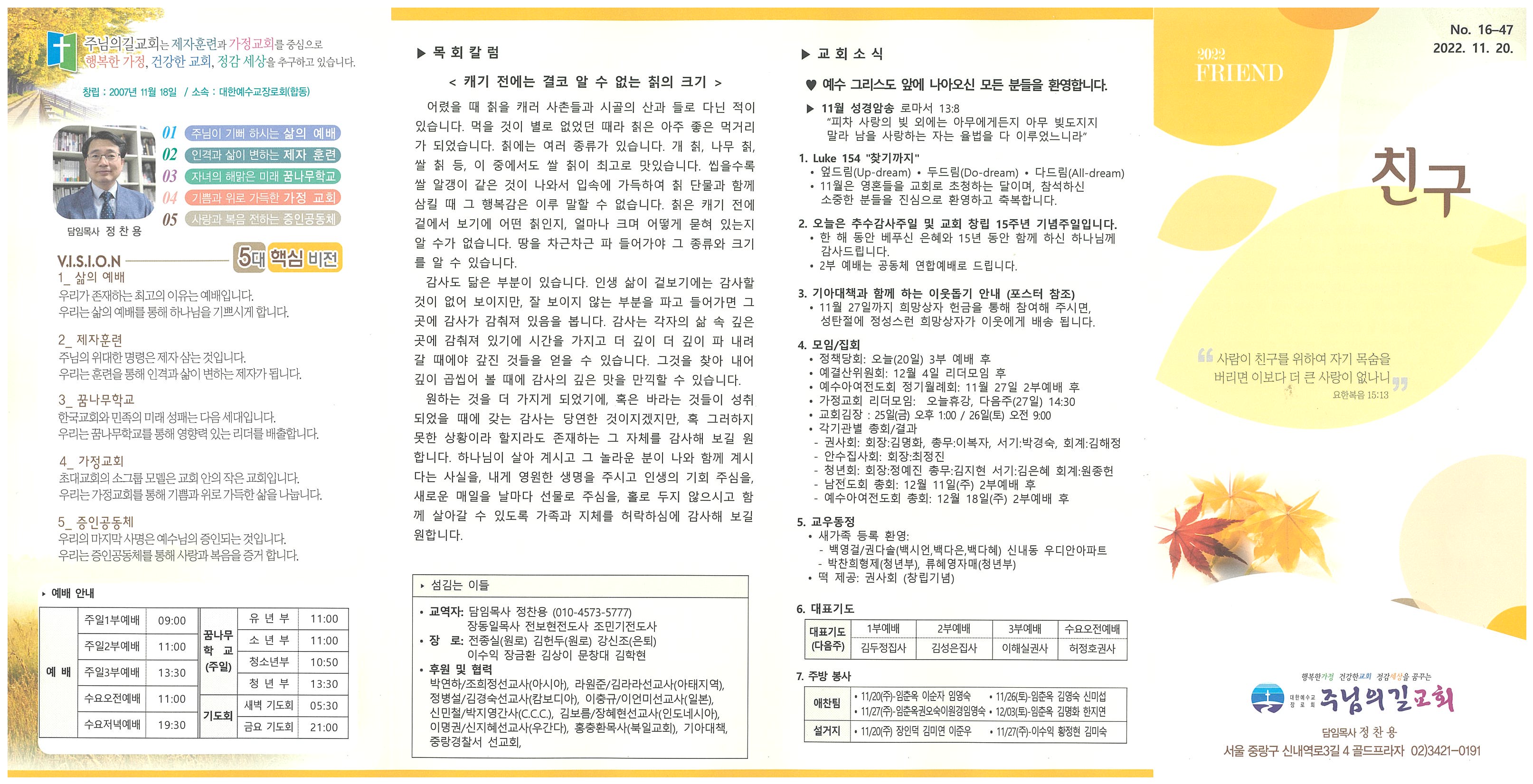 ♥ 예수 그리스도 앞에 나아오신 모든 분들을 환영합니다. ▶ 11월 성경암송 로마서 13:8 “피차 사랑의 빚 외에는 아무에게든지 아무 빚도지지 말라 남을 사랑하는 자는 율법을 다 이루었느니라” 1. Luke 154 "찾기까지" • 엎드림(Up-dream) • 두드림(Do-dream) • 다드림(All-dream) • 11월은 영혼들을 교회로 초청하는 달이며, 참석하신 소중한 분들을 진심으로 환영하고 축복합니다. 2. 오늘은 추수감사주일 및 교회 창립 15주년 기념주일입니다. • 한 해 동안 베푸신 은혜와 15년 동안 함께 하신 하나님께 감사드립니다. • 2부 예배는 공동체 연합예배로 드립니다. 3. 기아대책과 함께 하는 이웃돕기 안내 (포스터 참조) • 11월 27일까지 희망상자 헌금을 통해 참여해 주시면, 성탄절에 정성스런 희망상자가 이웃에게 배송 됩니다. 4. 모임/집회 • 정책당회: 오늘(20일) 3부 예배 후 • 예결산위원회: 12월 4일 리더모임 후 • 예수아여전도회 정기월례회: 11월 27일 2부예배 후 • 가정교회 리더모임: 오늘휴강, 다음주(27일) 14:30 • 교회김장 : 25일(금) 오후 1:00 / 26일(토) 오전 9:00 • 각기관별 총회/결과 - 권사회: 회장:김명화, 총무:이복자, 서기:박경숙, 회계:김해정 - 안수집사회: 회장:최정진 - 청년회: 회장:정예진 총무:김지현 서기:김은혜 회계:원종헌 - 남전도회 총회: 12월 11일(주) 2부예배 후 - 예수아여전도회 총회: 12월 18일(주) 2부예배 후 5. 교우동정 • 새가족 등록 환영: - 백영걸/권다솔(백시언,백다은,백다혜) 신내동 우디안아파트 - 박찬희형제(청년부), 류혜영자매(청년부) • 떡 제공: 권사회 (창립기념) 6. 대표기도 |