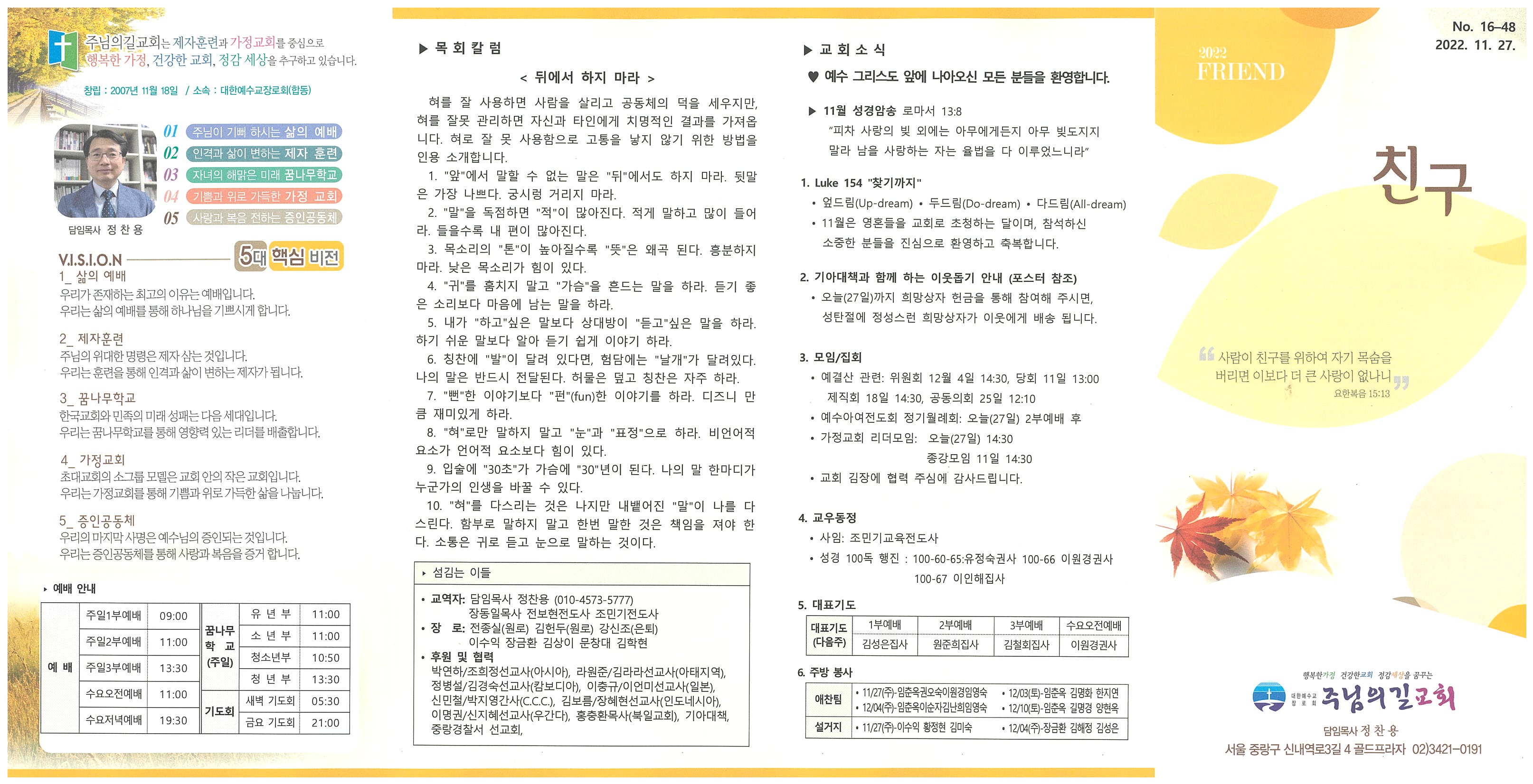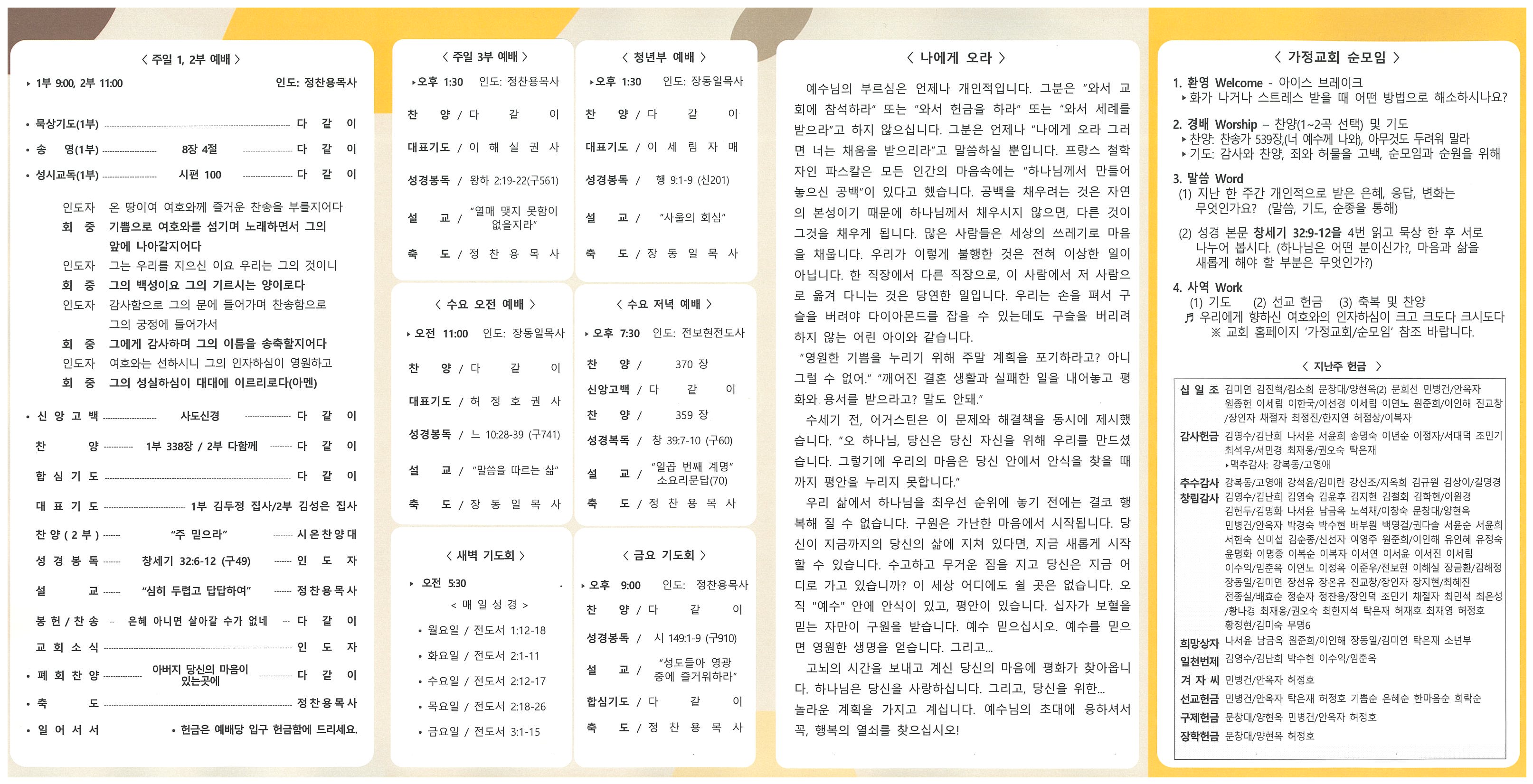 ♥ 예수 그리스도 앞에 나아오신 모든 분들을 환영합니다. ▶ 11월 성경암송 로마서 13:8 “피차 사랑의 빚 외에는 아무에게든지 아무 빚도지지 말라 남을 사랑하는 자는 율법을 다 이루었느니라” 1. Luke 154 "찾기까지" • 엎드림(Up-dream) • 두드림(Do-dream) • 다드림(All-dream) • 11월은 영혼들을 교회로 초청하는 달이며, 참석하신 소중한 분들을 진심으로 환영하고 축복합니다. 2. 기아대책과 함께 하는 이웃돕기 안내 (포스터 참조) • 오늘(27일)까지 희망상자 헌금을 통해 참여해 주시면, 성탄절에 정성스런 희망상자가 이웃에게 배송 됩니다. 3. 모임/집회 • 예결산 관련: 위원회 12월 4일 14:30, 당회 11일 13:00 제직회 18일 14:30, 공동의회 25일 12:10 • 예수아여전도회 정기월례회: 오늘(27일) 2부예배 후 • 가정교회 리더모임: 오늘(27일) 14:30 종강모임 11일 14:30 • 교회 김장에 협력 주심에 감사드립니다. 4. 교우동정 • 사임: 조민기교육전도사 • 성경 100독 행진 : 100-60-65:유정숙권사 100-66 이원경권사 100-67 이인해집사 5. 대표기도 |
