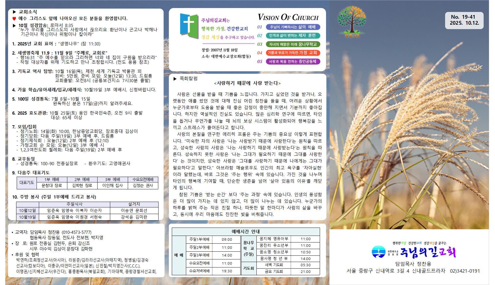 ▶ 10월 성경암송: 로마서 8:35 “누가 우리를 그리스도의 사랑에서 끊으리요 환난이나 곤고나 박해나 기근이나 적신이나 위험이나 칼이랴“ 1. 2025년 교회 표어 : “생명나무” (잠 11:30)