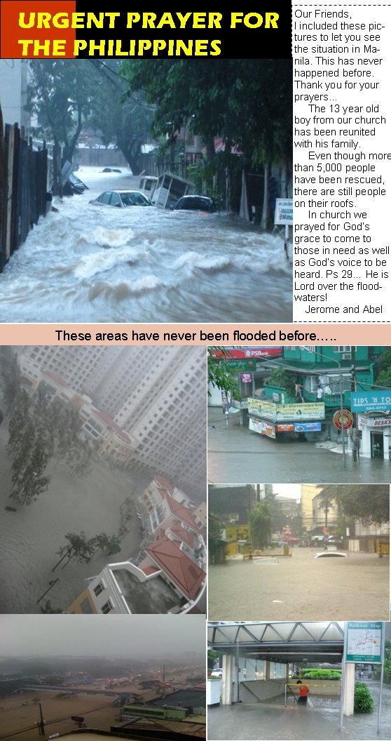 사랑하는 동역자님, 현재 아시아 전체가 자연재난으로 몸살을 앓고 있는 것을 아실 것입니다. 필리핀에는 홍수가 나서 50만 명 이상의 이재민이 발생했고, 연이은 사모아의 쓰나미와 인도네시아의 대지진으로 수많은 사람이 목숨을 잃은 것을 보도를 통해 접하셨을 것으로 압니다. 그 중에서도 필리핀의 소식을 전하며 동역자님의 관심과 기도를 부탁드립니다. 필리핀에 계신 많은 한인 선교사들이 큰 피해를 당했다는 소식이 들어오고 있으며, 특히 한국CEF에서 파송된 최광기 선교사님과 서성복 선교사님 역시 많은 피해를 입었다고 합니다. 또한 필리핀 CEF의 현지 사역자들 중 다섯 명 정도가 이번 홍수로 인해 집이 완전히 떠내려 가버리는 엄청난 피해를 입었다고 합니다.