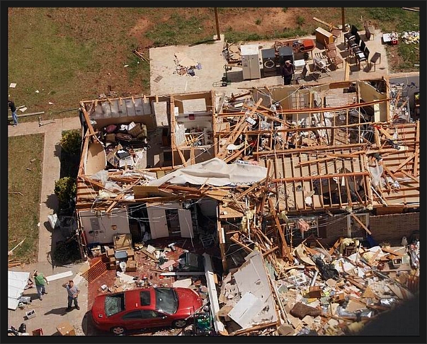 <토네이도로 인해 파괴된 주택. 대피할 공간인 지하실이 없는 이동용 주택 등에 사는 사람들이 목숨을 잃는 경우가 많다 합니다.>