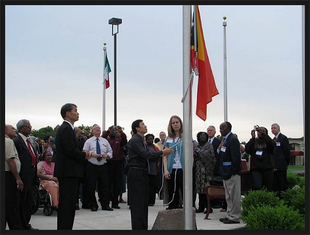 CEFON 모임 중에 뜻 깊은 기도회가 있었습니다. 국제본부 앞에는 커다란 지구본과 국기 계양대가 설치되어 있습니다. 8개의 계양대에는 각 지역의 국가들을 매주 하나씩 선정하여 국기가 계양되며, 별도로 있는 하나의 계양대에는 어린이전도협회의 사역이 아직 열리지 않은 미개척 국가의 국기들 중 하나가 선정되어 계양됩니다. 그리고 매주 특정한 날 국기 계양대 앞에서 국기를 교체하며 기도회를 가집니다. 그런데 그 주 기도회 시간에는 마침 동티모르의 국기가 미개척 국가 계양대에 있었습니다. 한국의 김진수 선교사 가정이 사역하고 있는 동티모르는 국제대회 직후 열린 국제이사회에서 새로운 CEF 국가로 열렸습니다. 그래서 저와 한국의 조정환 대표가 미개척 국가 계양대에 있던 동티모르 국기를 내려 AP의 계양대로 옮기는 뜻 깊은 자리가 마련되었습니다. 동티모르 국기 계양 직후 조 목사님은 동티모르를 위해 뜨겁게 기도해 주셨습니다.